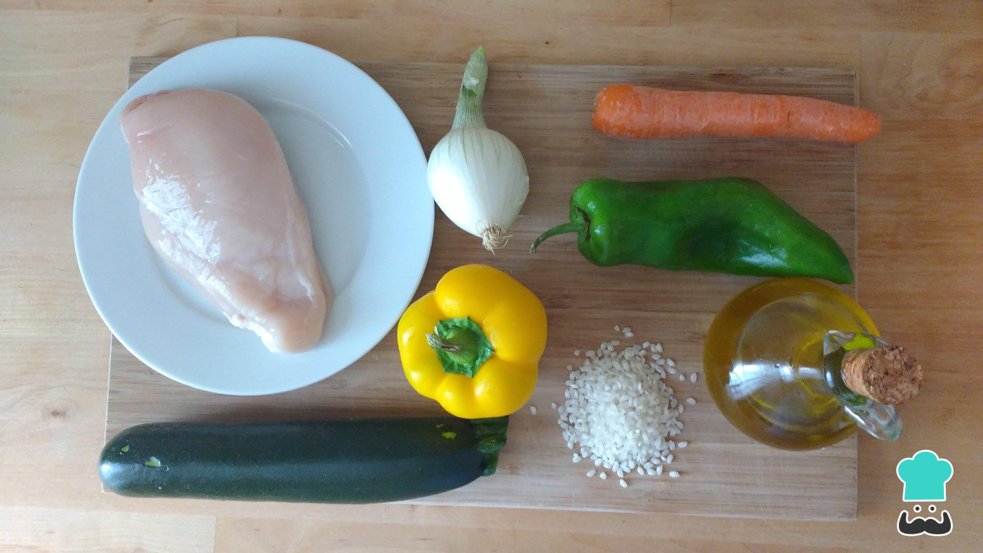 Reunimos todos los ingredientes para preparar el arroz con pollo y verduras. A parte de las verduras que hemos utilizado podéis añadir otras como la berenjena o incluso el tomate natural.