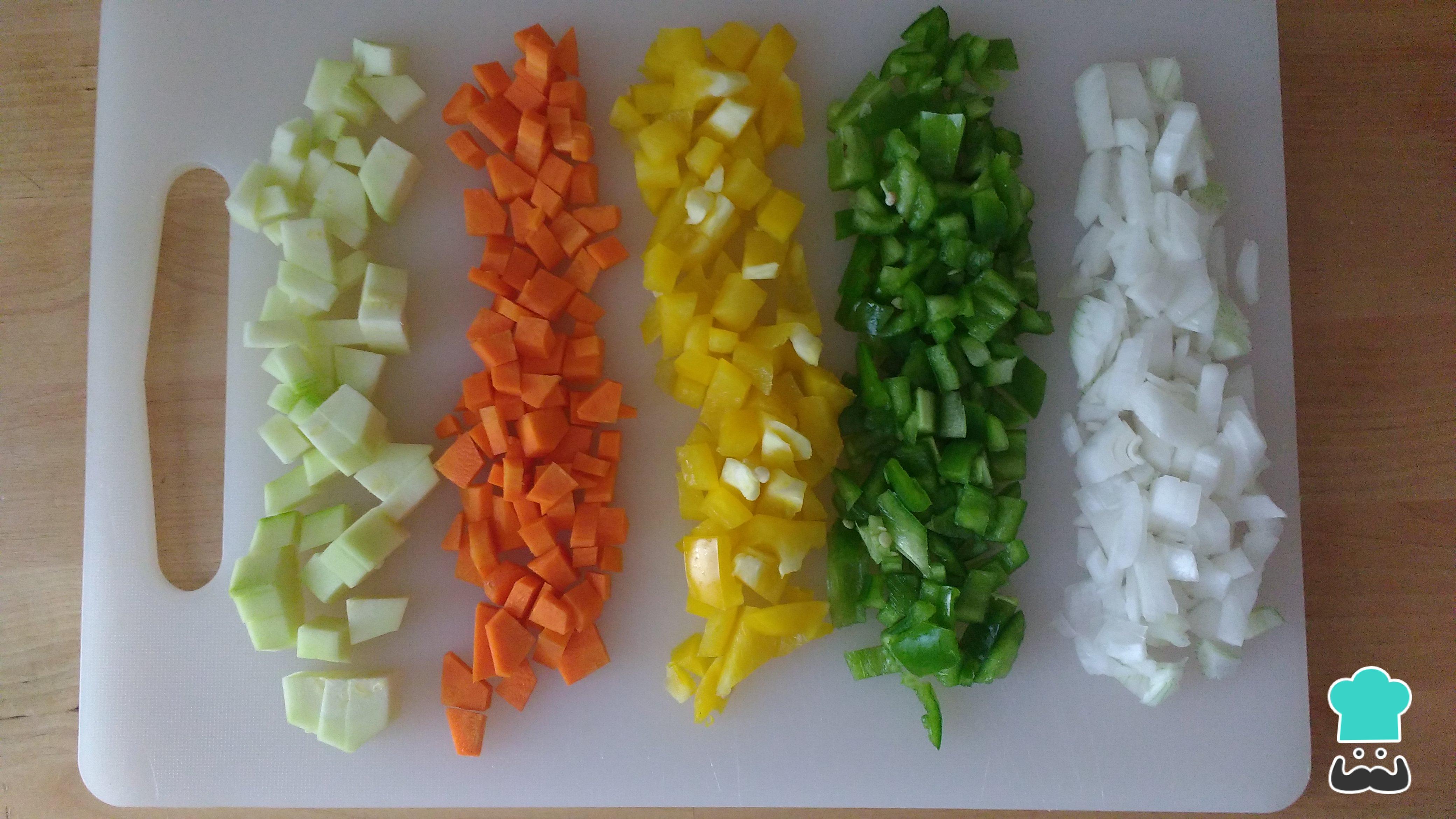 Cortamos las verduras en cuadraditos tal y como indicamos en la imagen. En el caso de la zanahoria y el calabacín, los pelamos previamente.