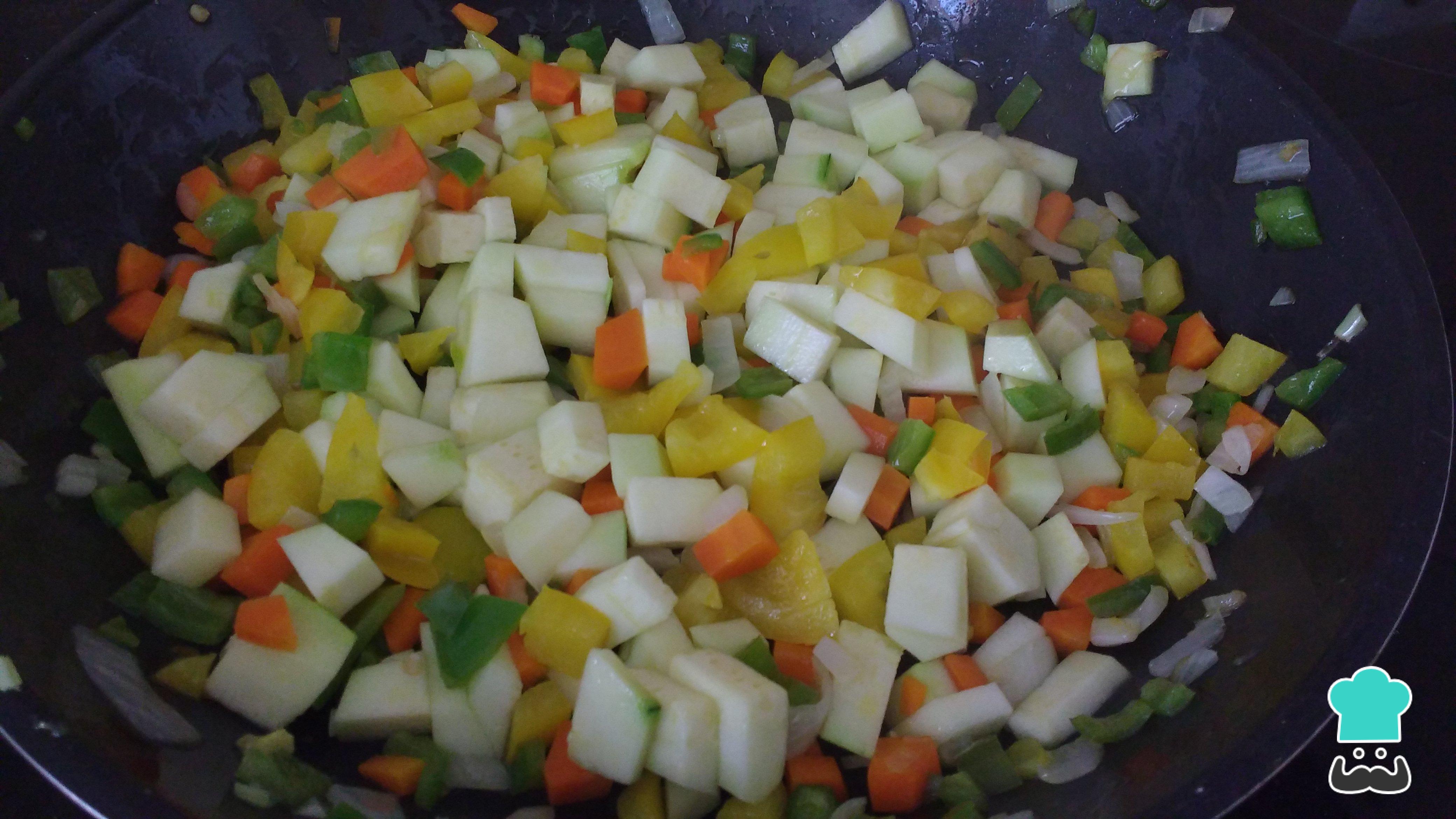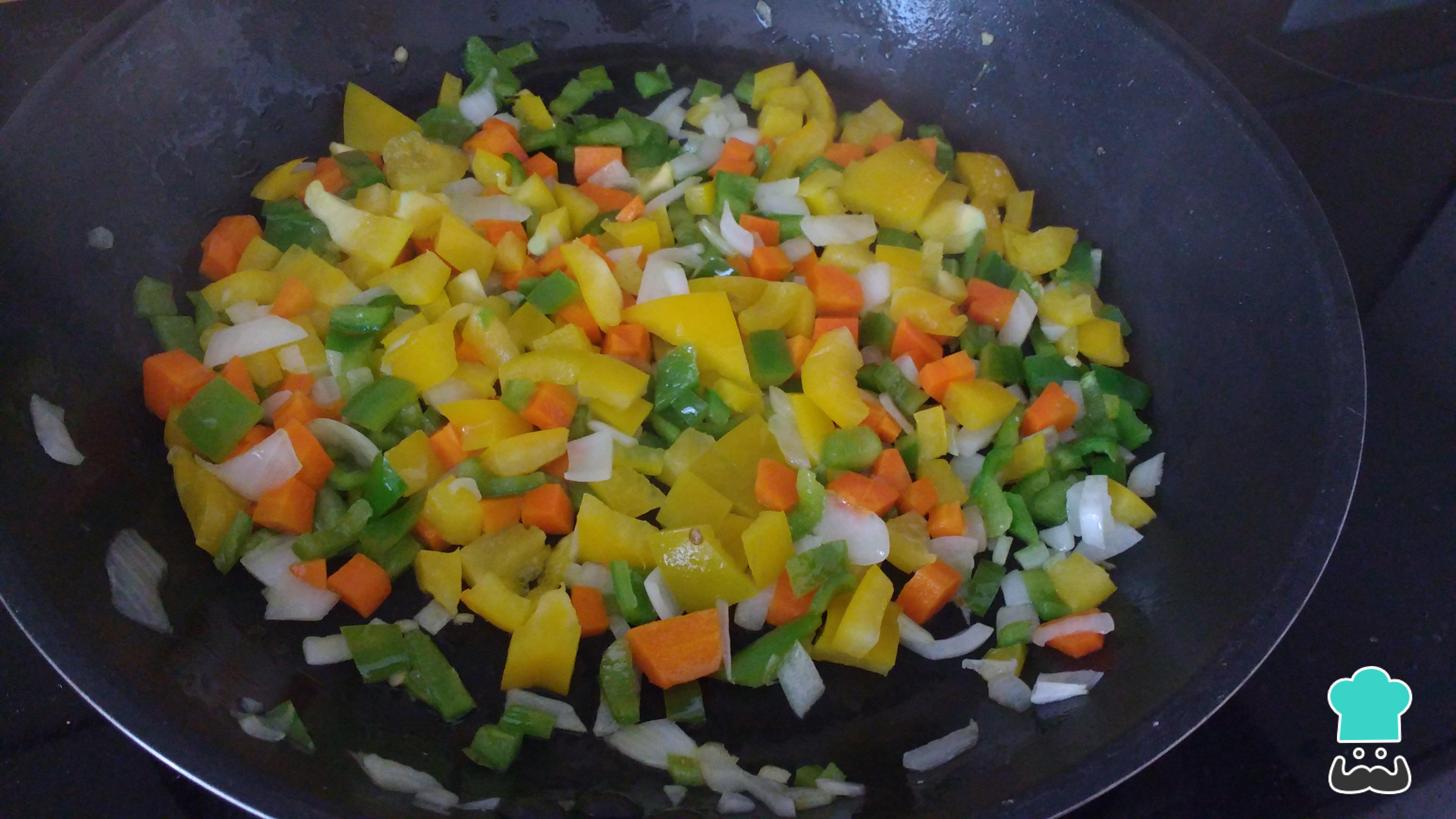 En una sartén ponemos 2-3 cucharadas de aceite de oliva y vamos añadiendo las verduras en el siguiente orden: cebolleta, pimientos y zanahoria. Antes de incorporar la siguiente verdura dejamos que cada una se cocine unos 3 minutos.