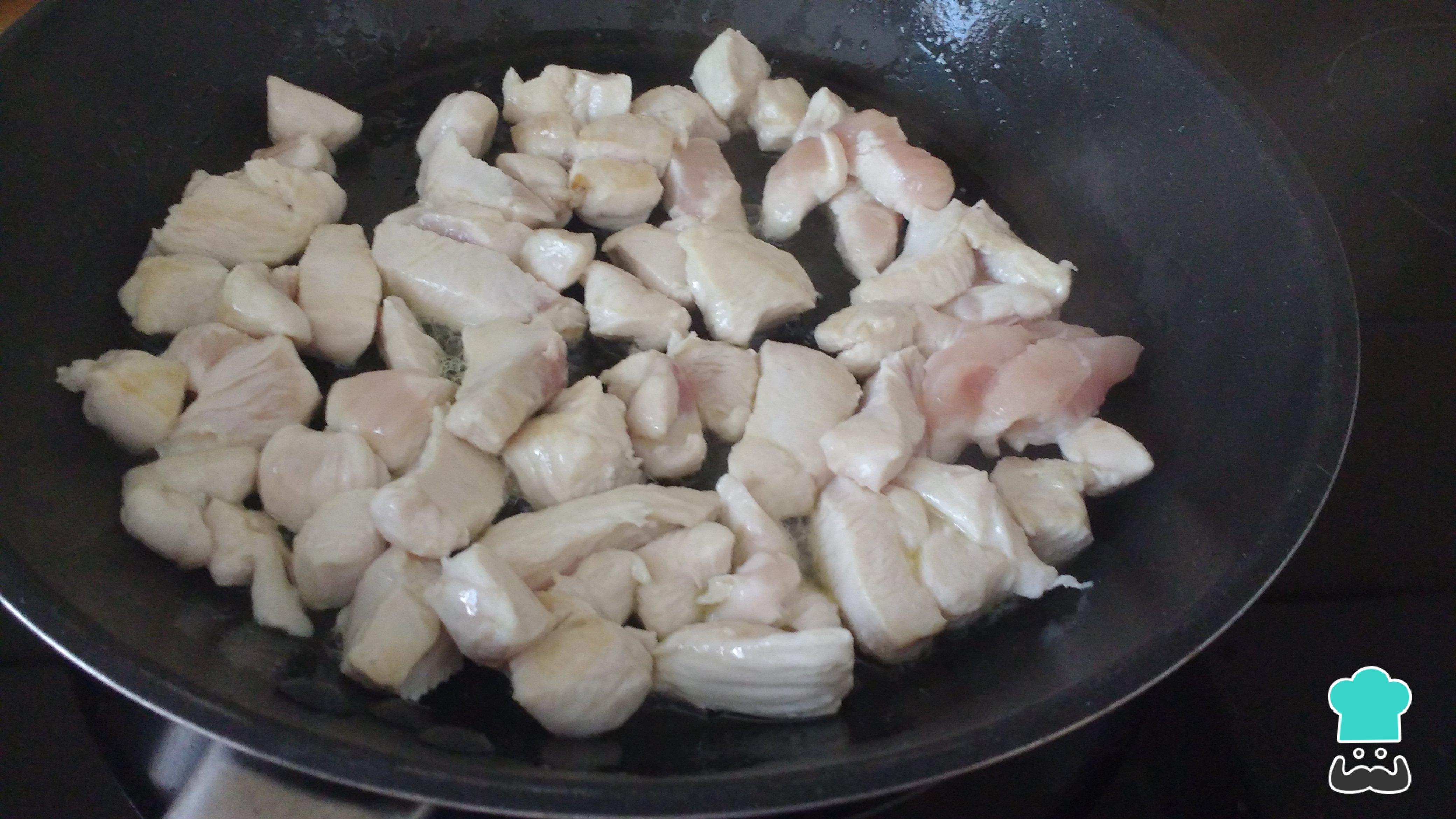En otra sartén salteamos la pechuga de pollo troceada y ponemos un poco de sal y de pimienta negra molida. Estará lista en 5 minutos si los trozos no son demasiado grandes.