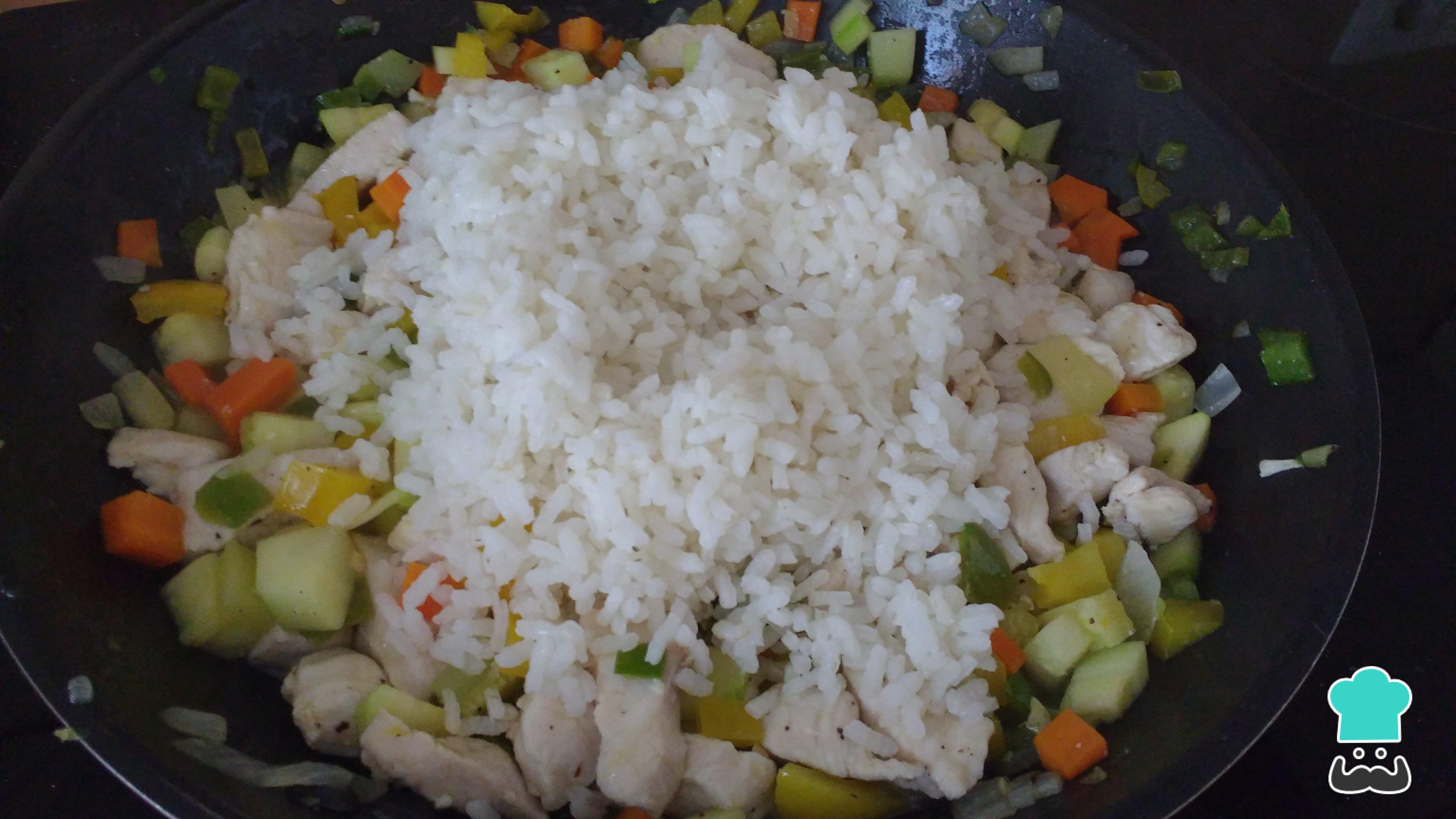 Una vez cocinamos todos los ingredientes, añadimos el arroz cocido y el pollo a nuestro sofrito de verduras. Removemos y rectificamos de sal si es necesario. También podéis aderezar con alguna hierba aromática como el orégano o la albahaca.