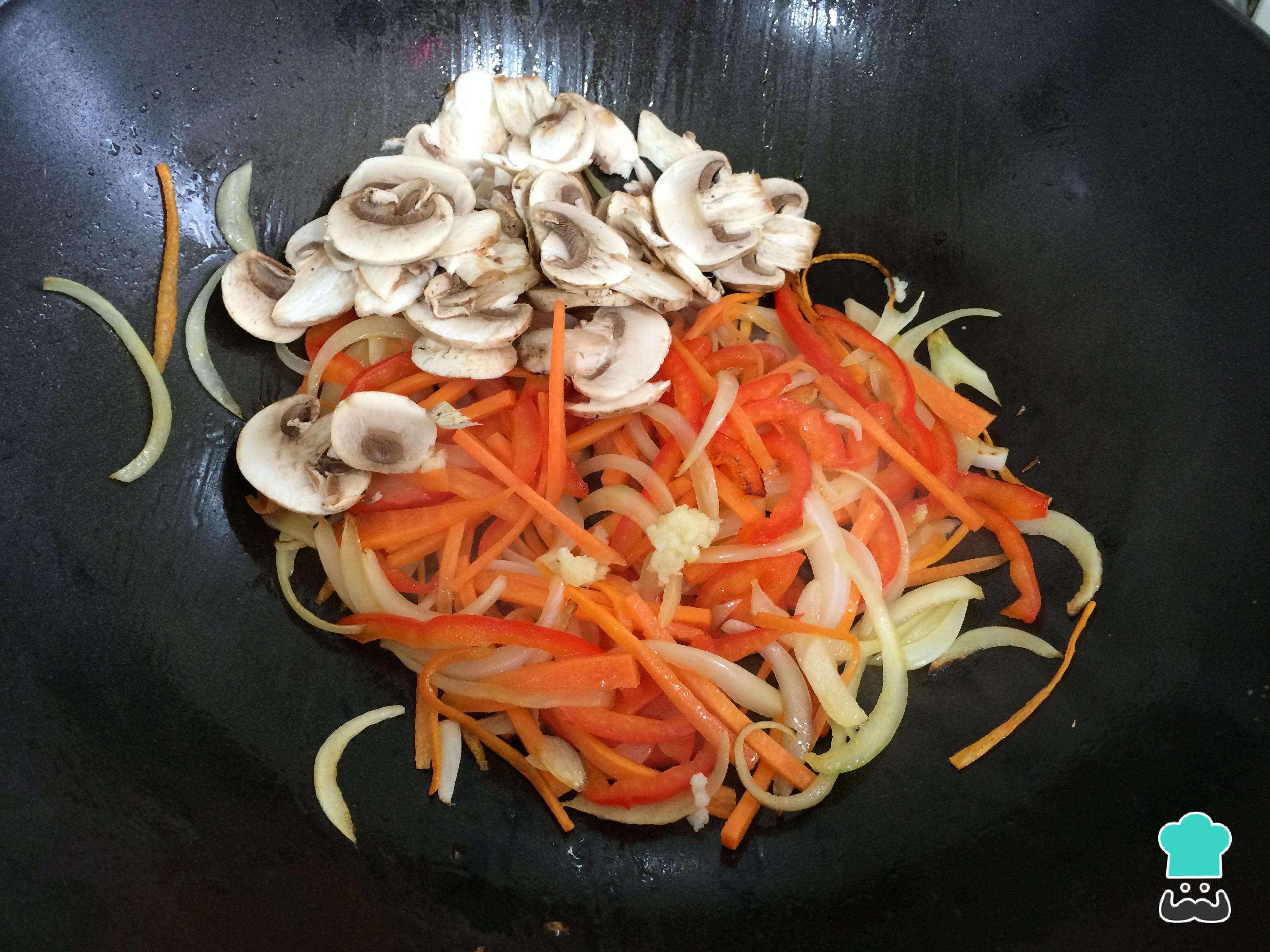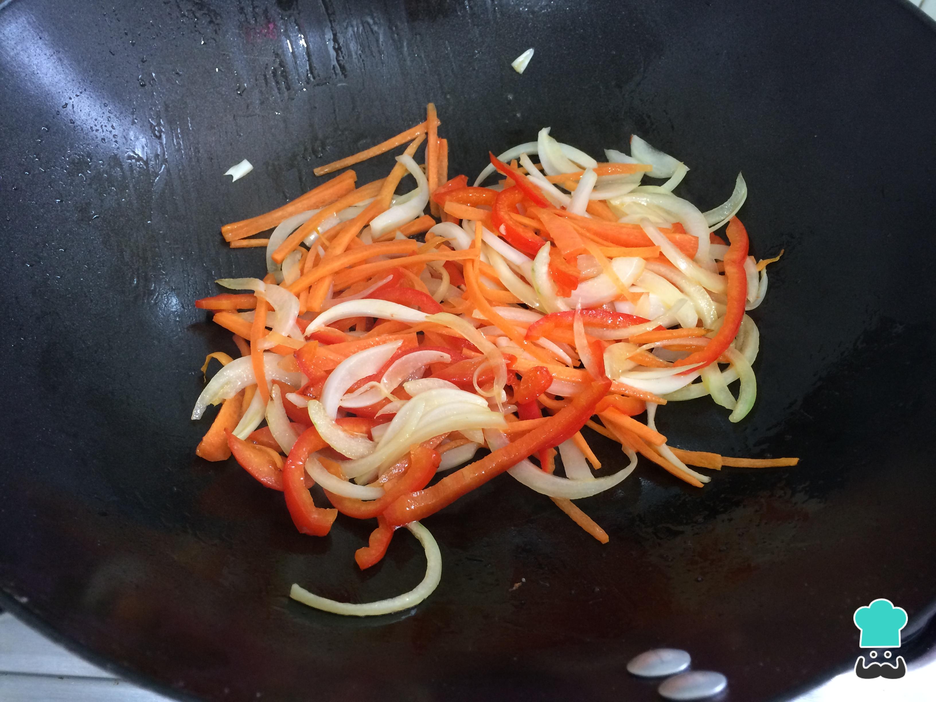 En un wok con aceite, saltear la cebolla, la zanahoria y el pimiento rojo cortados en tiras delgadas hasta que este blando.