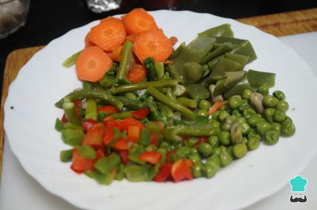 Lava y limpia las verduras, córtalas en trozos pequeños para que se cuezan junto con el arroz. Si están congeladas no hace falta descongelarlas.