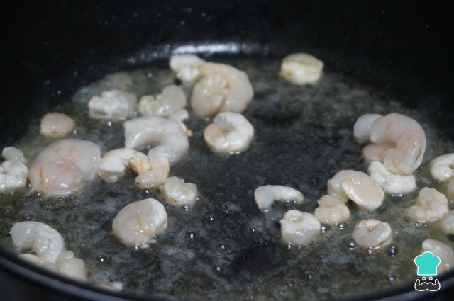 En una cazuela pon un chorro de aceite, añade las gambas peladas y saltéalas. Saca y reserva.
