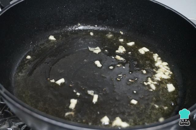 En la misma cazuela añade un poco más de aceite si hace falta, pon el fuego medio y añade los ajos picados.