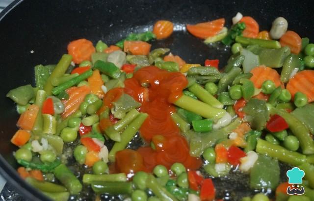 Antes de que cojan color los ajos añade las verduras, saltea todo junto unos 5 minutos. Agrega el tomate frito y remueve.