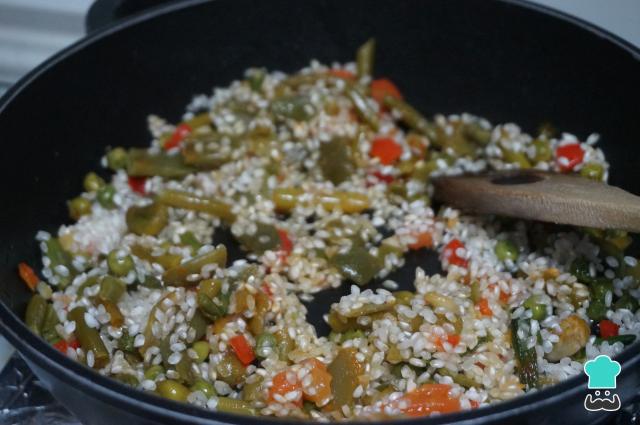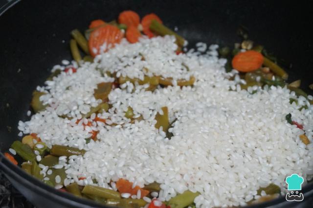 Añade el arroz a la cazuela junto a las verduras.