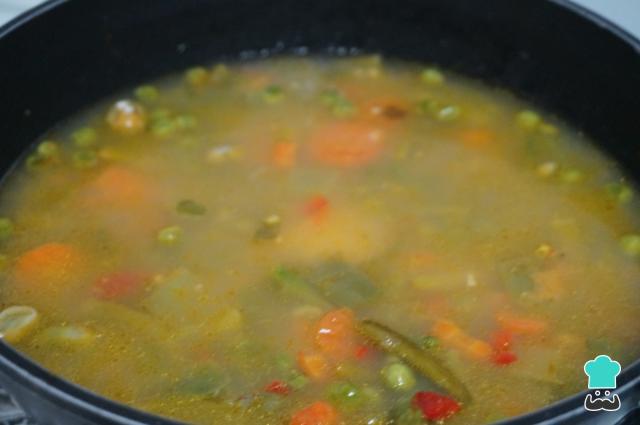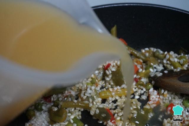 Vierte el caldo de pescado o agua en la preparación del arroz con verduras y gambas peladas. También se puede añadir mitad y mitad para que no tenga el sabor muy fuerte.