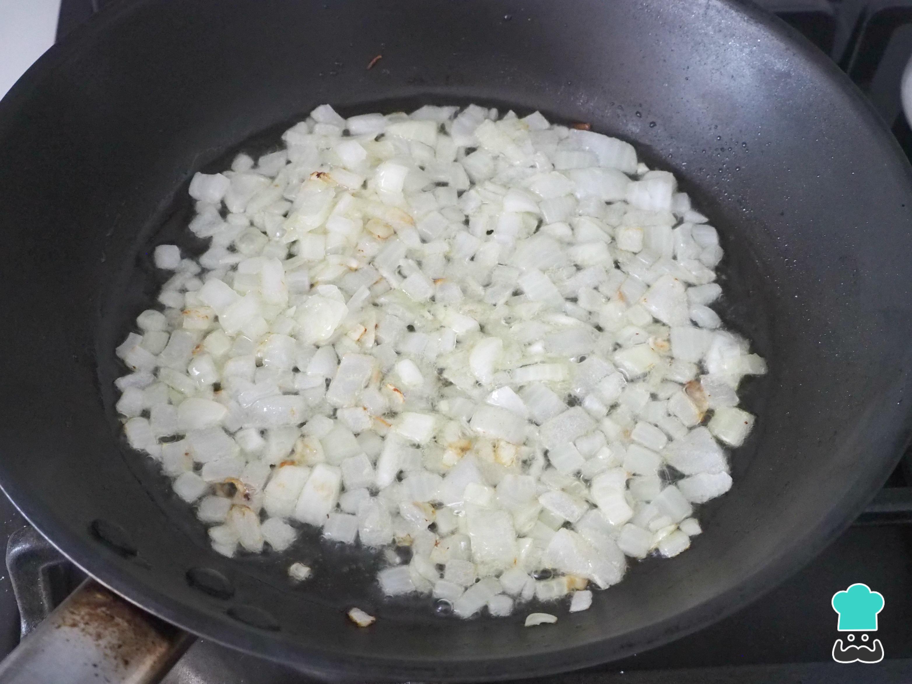 En primer lugar, lo primero que tenemos que hacer para preparar este arroz con verduras y jamón serrano es poner una sartén con un poco de aceite, y ponemos a dorar la cebolla.