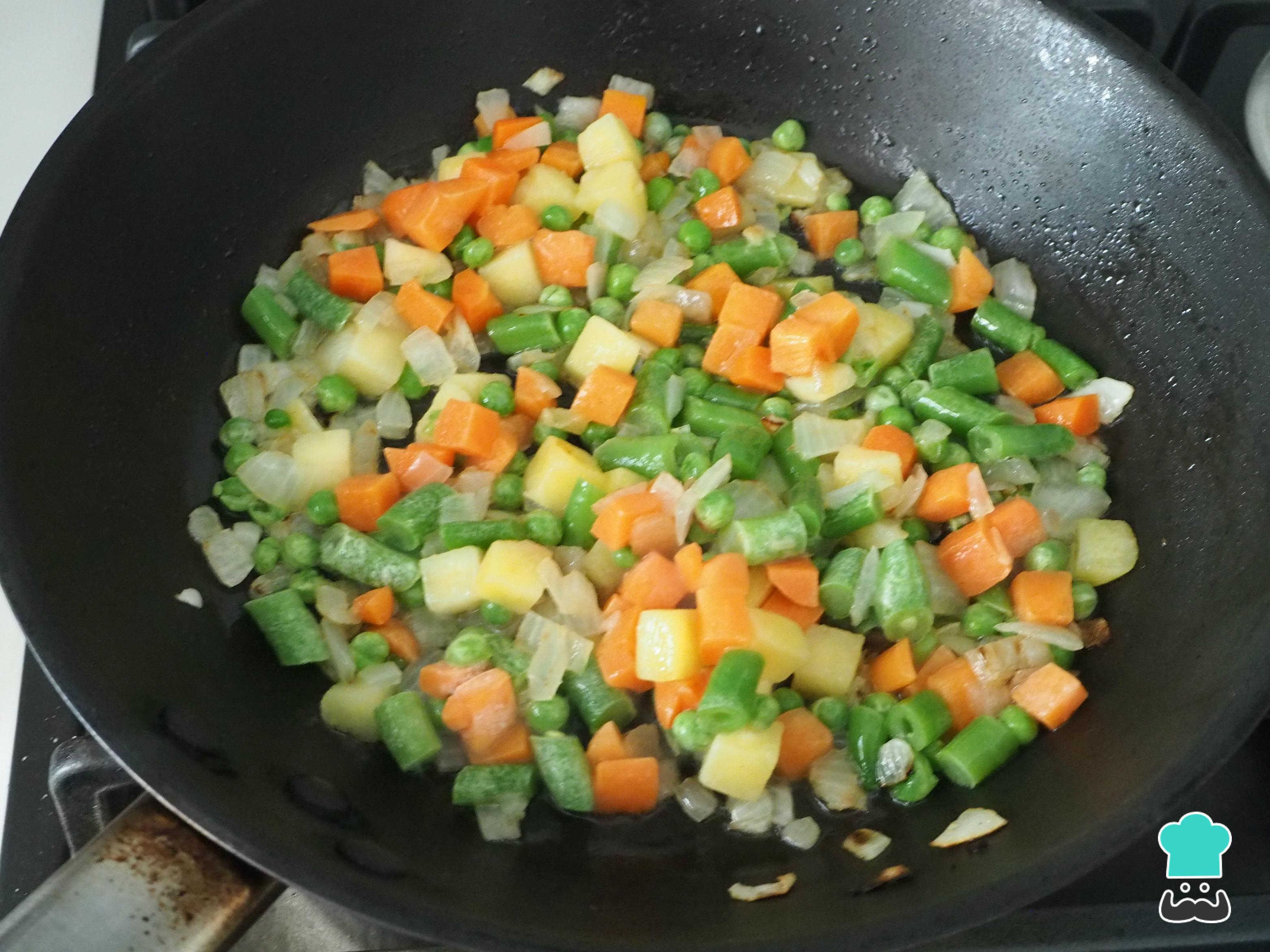 Cuando empiece a estar tierna, añadimos las verduras congeladas y removemos.