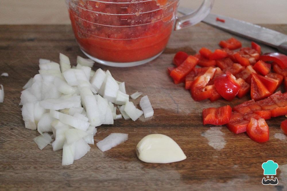 Pela la cebolla y el ajo y pícalos. Parte el pimiento por la mitad, retira las semillas y trocéalo en pedazos pequeños. Pela los tomates, retira las semillas y tritúralos con ayuda de una batidora o procesadora de alimentos.