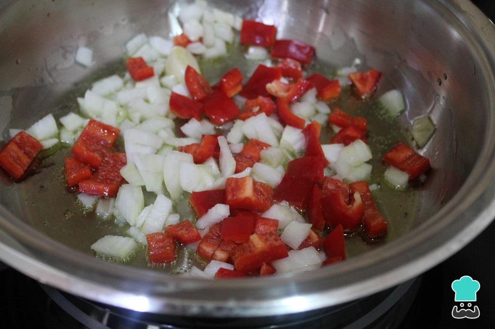 En una cacerola amplia, pon el aceite a calentar. Cuando esté listo, añade la cebolla, el pimiento y el ajo, y sofríe 3 o 4 minutos.