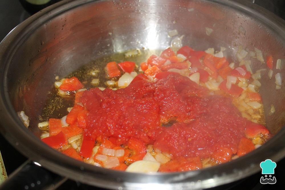 Incorpora el tomate triturado y sofríe 3 minutos más.