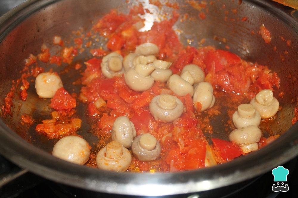 Añade las setas. En este caso, hemos utilizado champiñones baby de lata, pero puedes utilizar setas variadas. Si son setas de cardo, córtalas en trozos más pequeños. Remueve durante 1 minuto.