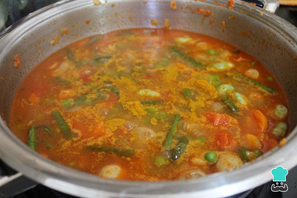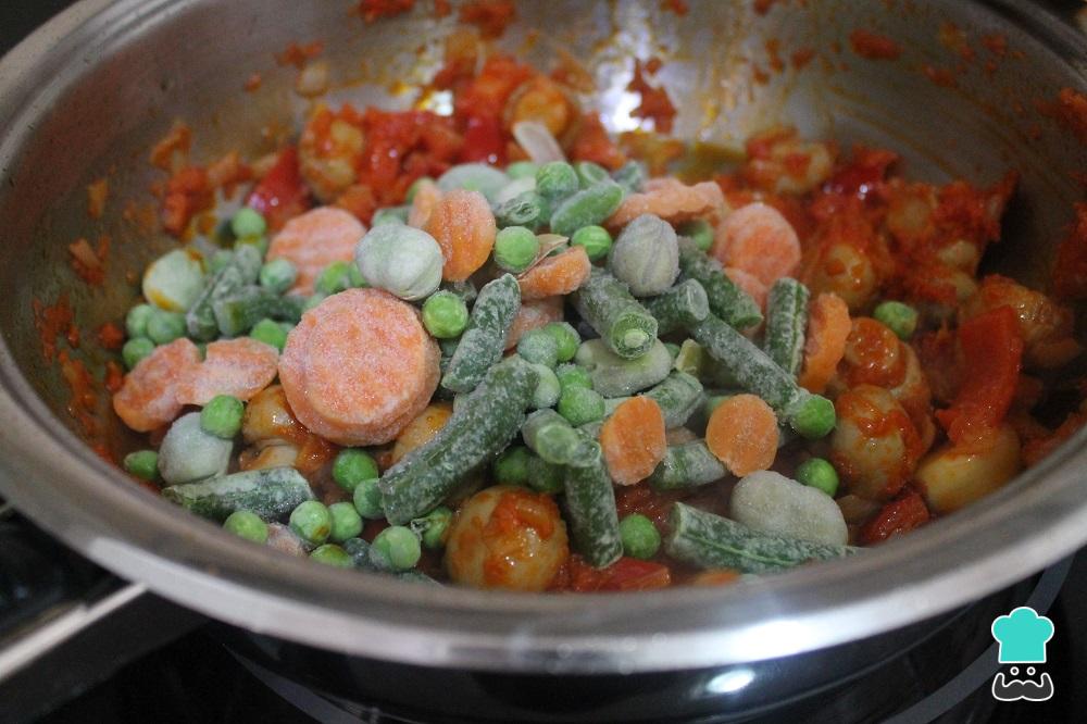 Truco: Hemos utilizado una menestra congelada que lleva guisantes, habas, judías verdes y zanahoria, pero puedes añadir las verduras frescas y quitar las que no te gusten o añadir otras que te gusten más.