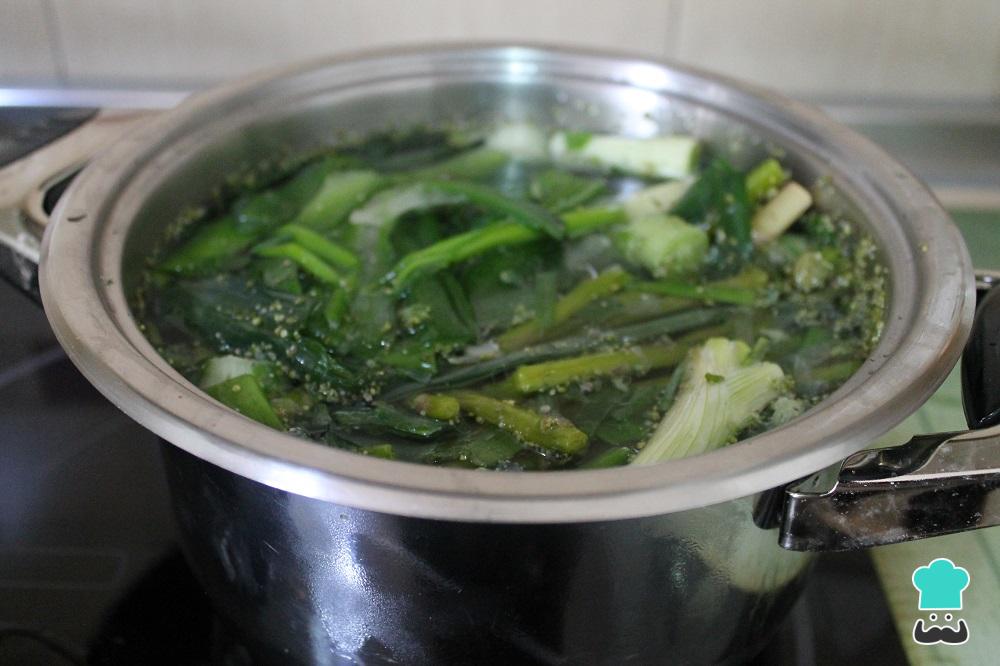 Para hacer el caldo de verduras, hemos reciclado la parte dura de los espárragos, los tallos de los ajetes tiernos, la parte verde de los puerros y unos trozos de brócoli que se habían puesto amarillos. Pon todo en una olla con agua y cuécelo por 30 minutos.
