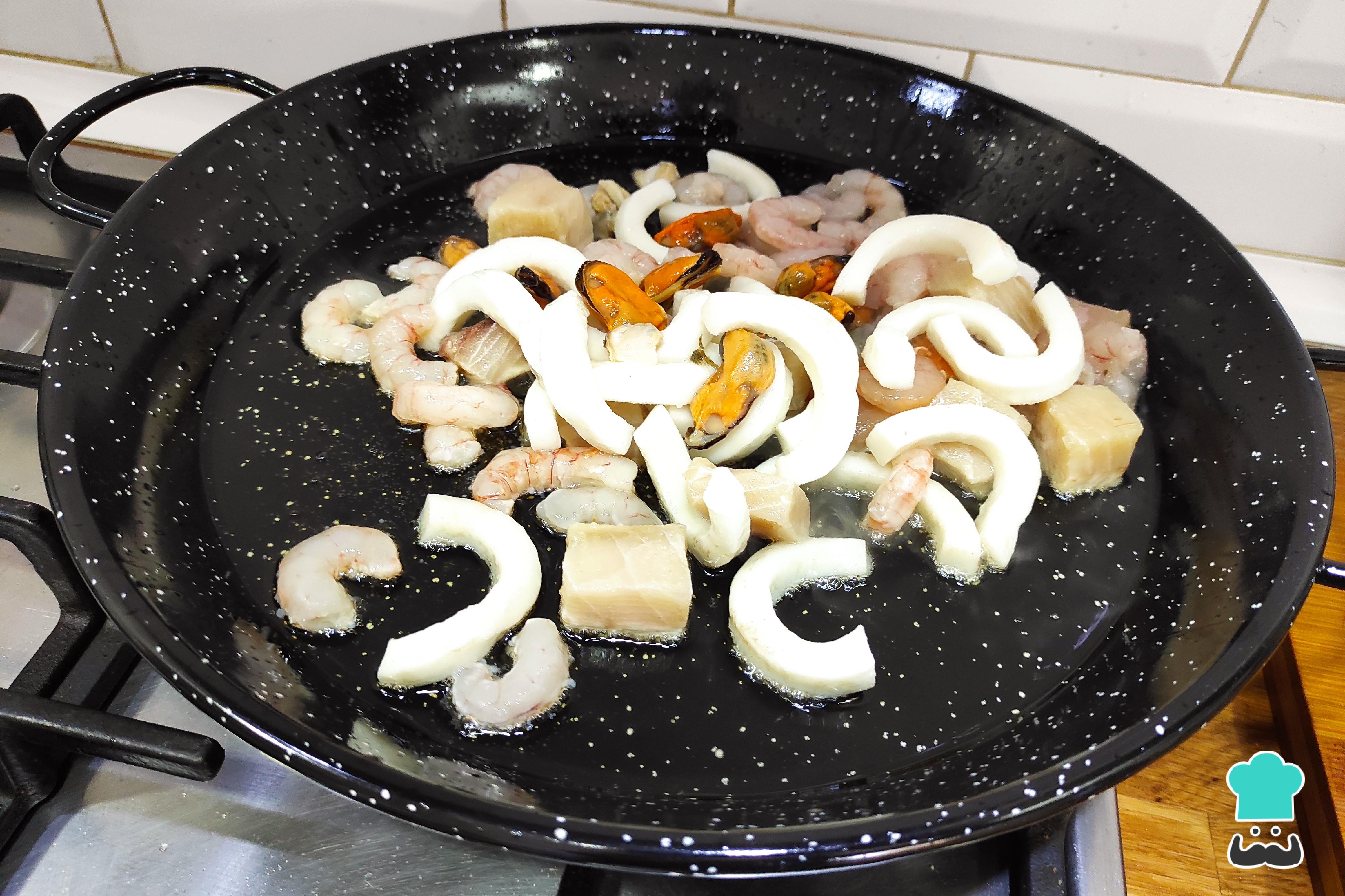Calienta un buen chorro de aceite en una paellera o sartén y sofríe el marisco y el pescado, removiendo para que se haga por todas partes, durante aproximadamente 3 minutos. Al ser pedazos pequeños, no será necesario más tiempo. Reserva para seguir con la receta de paella del senyoret.
