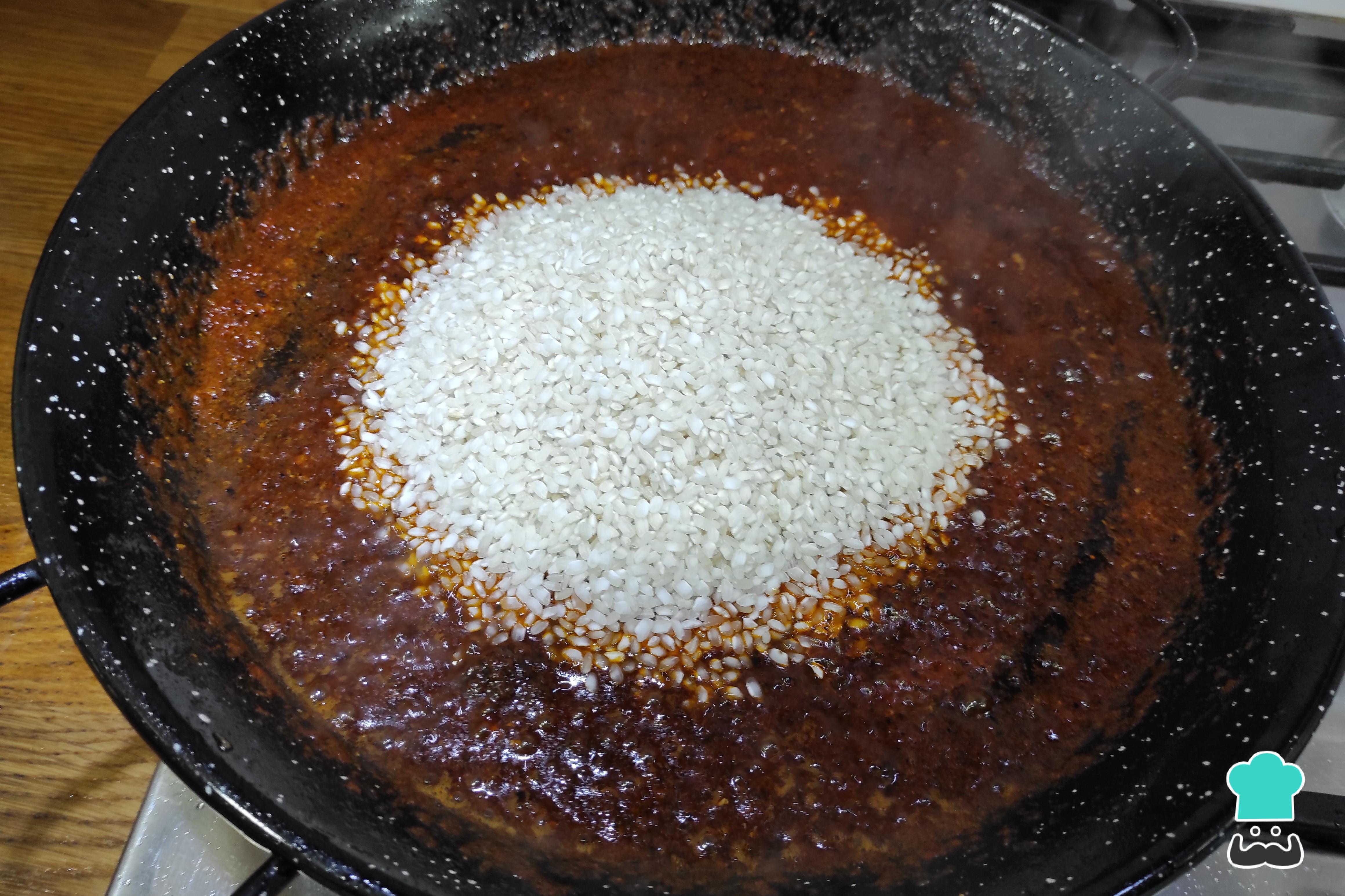 Una vez diluida la salmorreta, añade el arroz y remueve para que se empape bien. Por otro lado, ten preparado el fumet o caldo de pescado. Puedes utilizar dos pastillas de caldo de pescado y añadir agua o emplear caldo de pescado casero o comercial, aunque el arroz del senyoret quedará mucho más sabroso con el caldo casero.