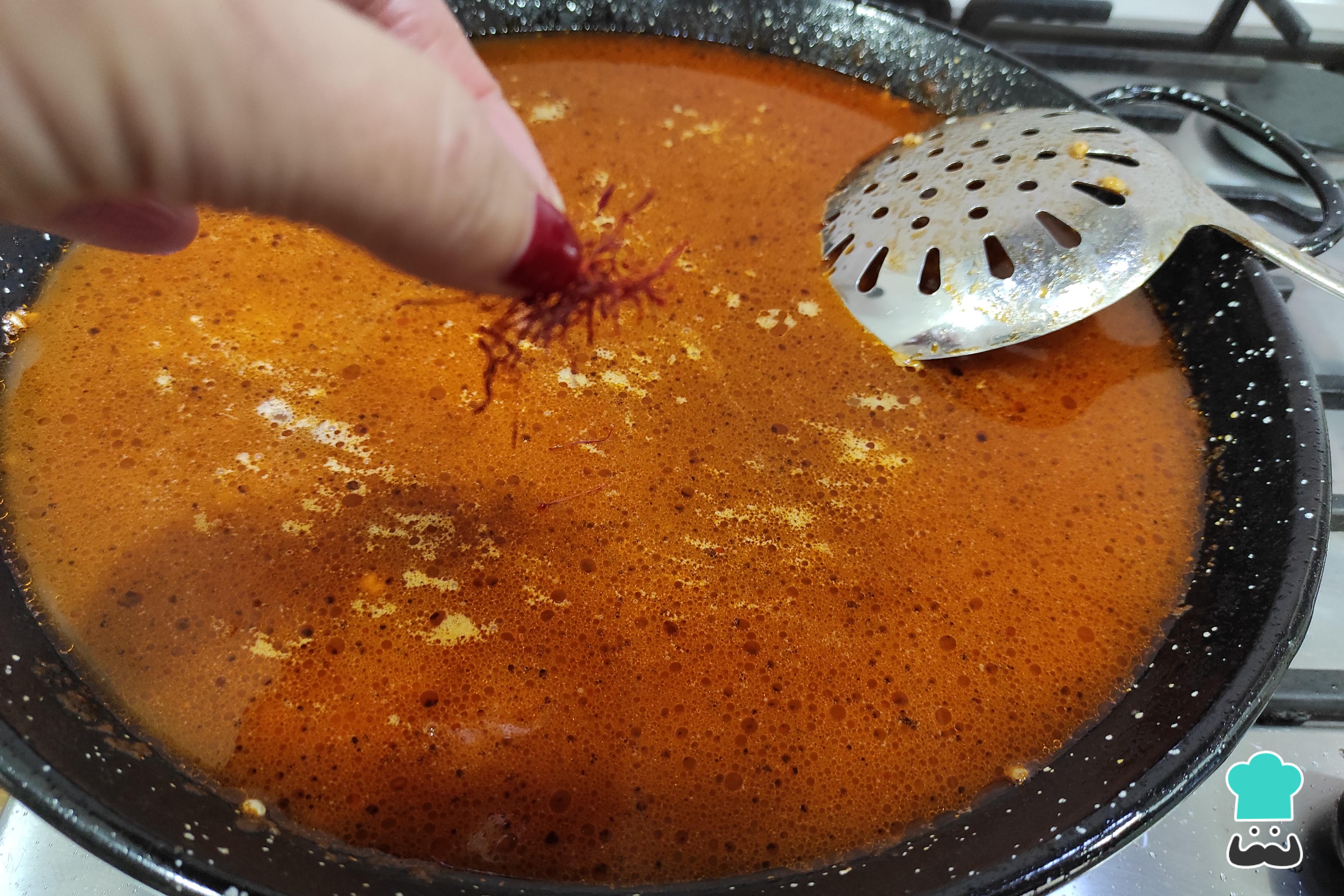 Espera a que comience a hervir el caldo y agrega las hebras de azafrán repartiéndolas por toda la paellera o sartén. Si no tienes azafrán, puedes usar colorante alimentario, aunque el sabor del azafrán en hebra es un condimento muy importante en este sabor mediterráneo.