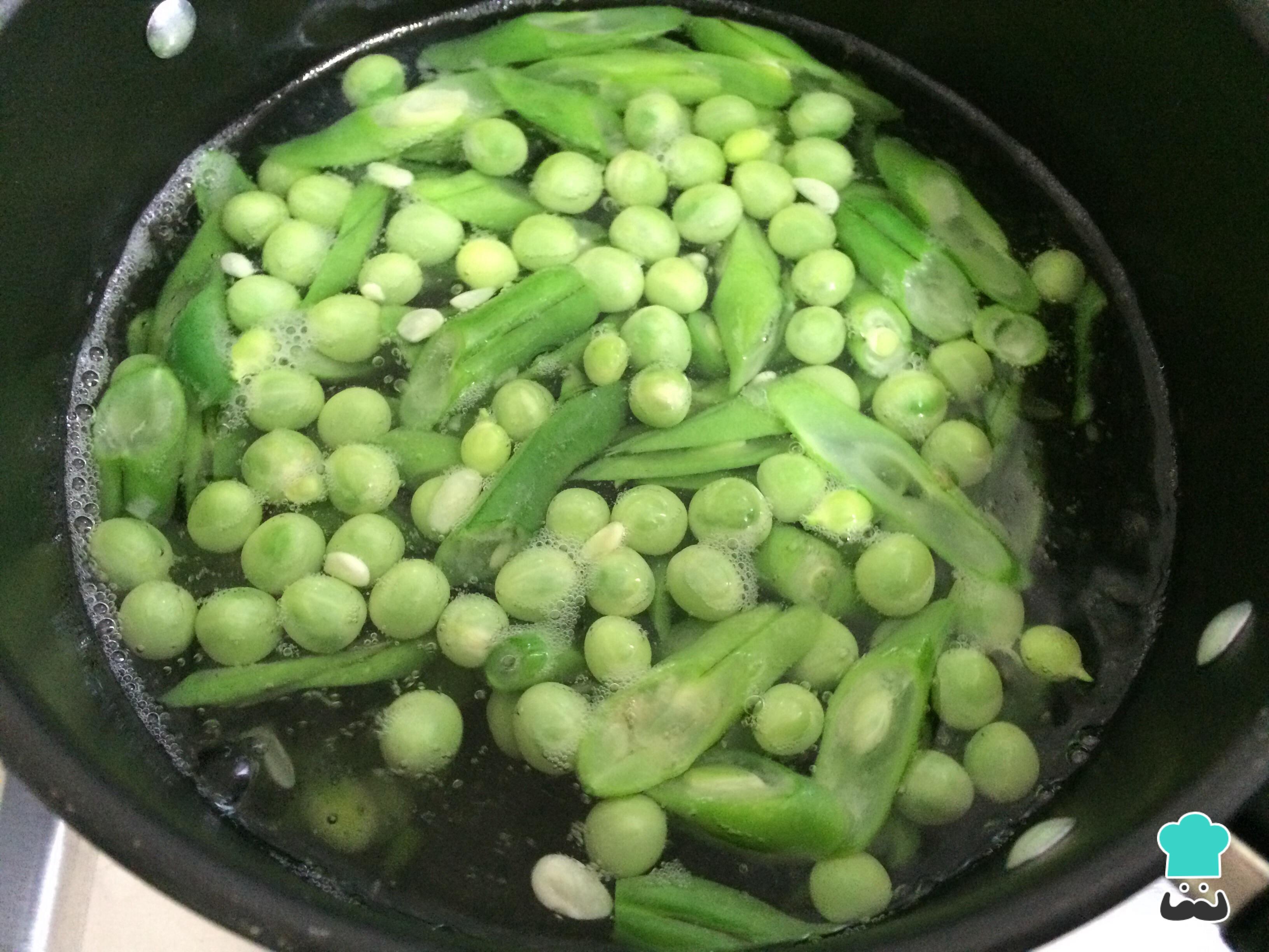 En una olla con agua hirviendo, añadir las habichuelas cortadas en tiras y los guisantes, cocinar durante 10 minutos, escurrir y reservar.