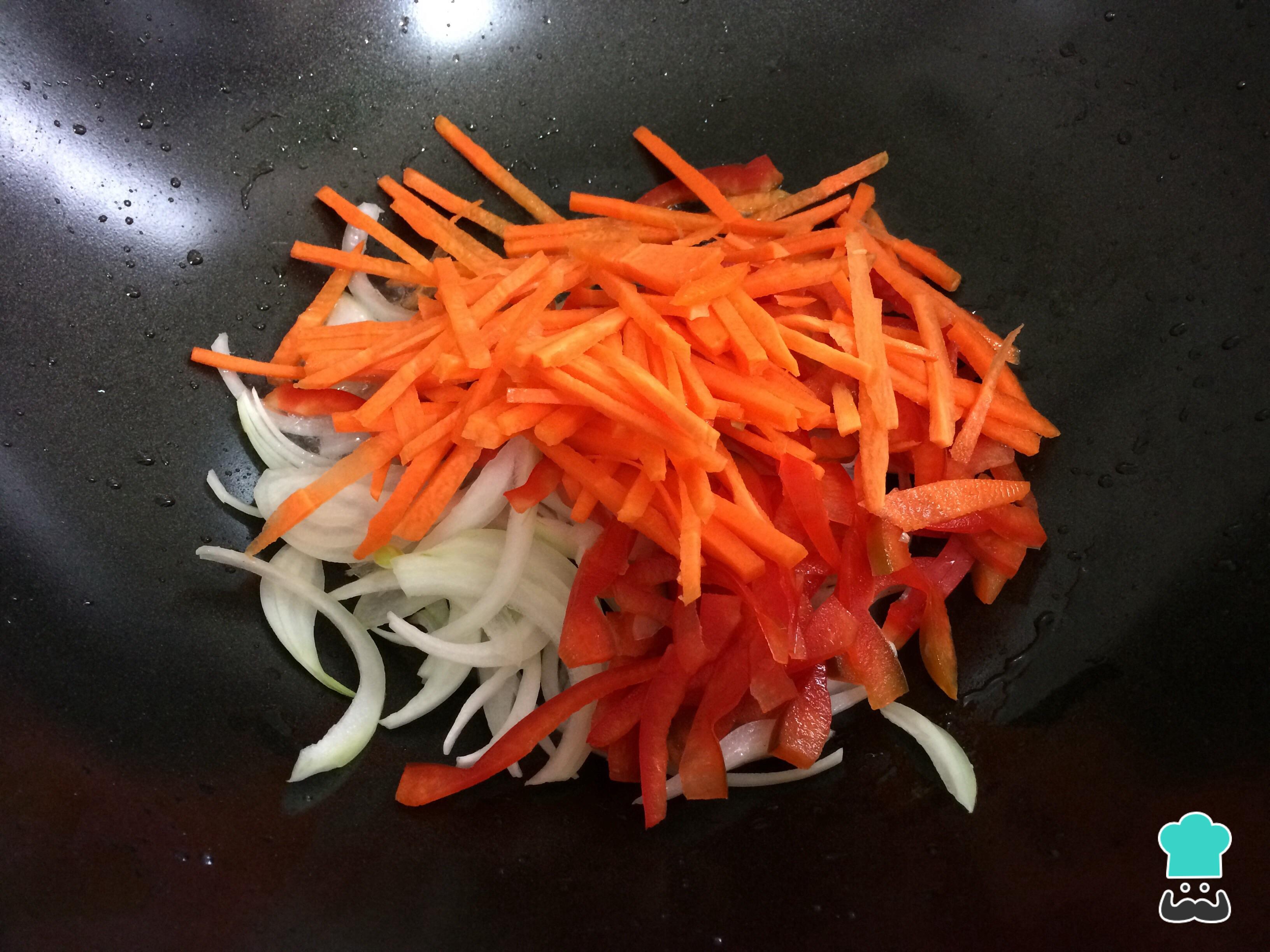 En un wok con aceite, saltear la cebolla, la zanahoria y el pimiento rojo cortado en tiras delgadas, cocinar durante 5 minutos.