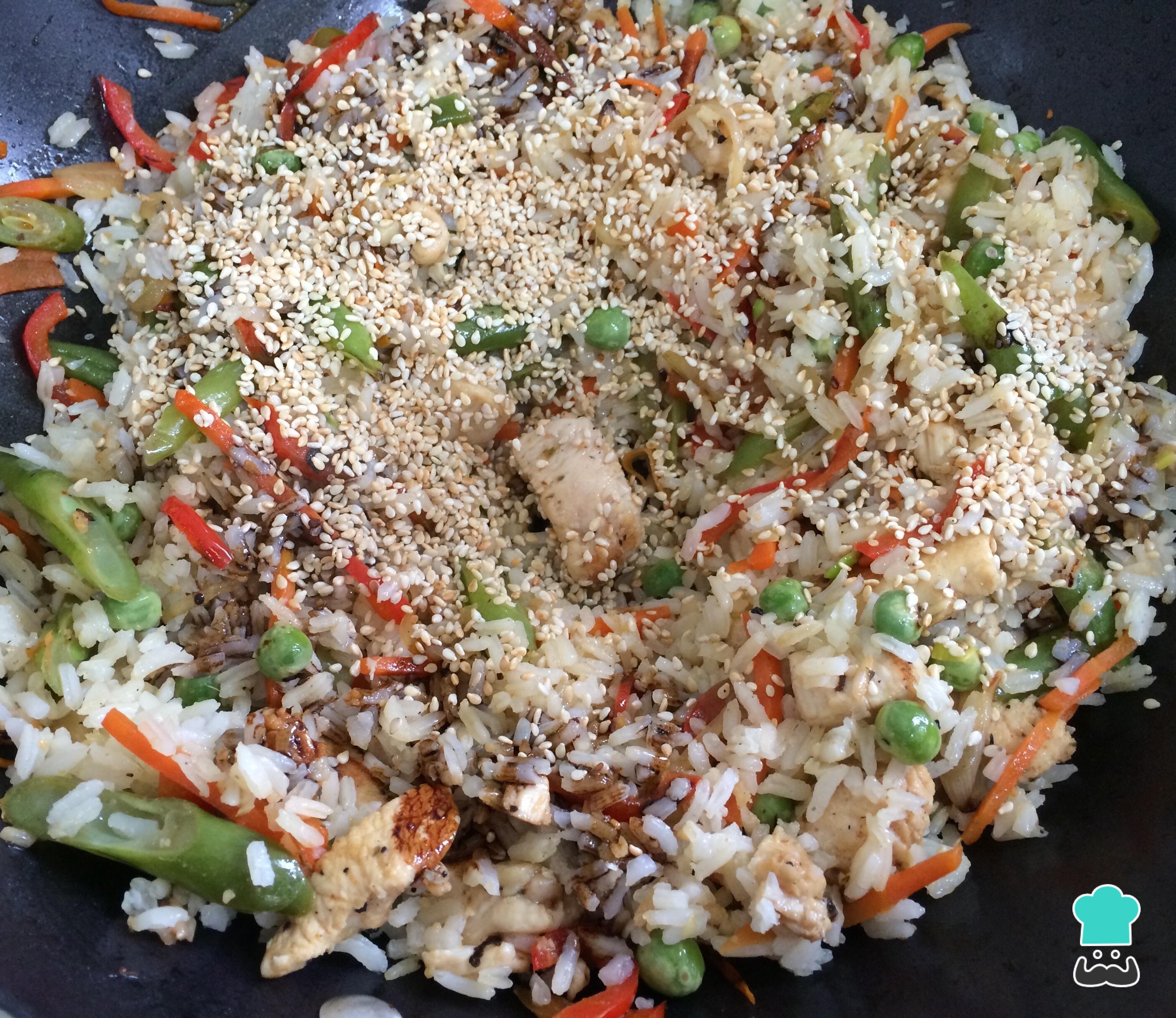 Volver agregar las verduras, la dos tazas de arroz blanco cocido, la salsa de soya y las semillas de ajonjolí, mezclar todo muy bien. Cocinar durante 10 minutos más, si es necesario rectificar el sabor con sal y pimienta.