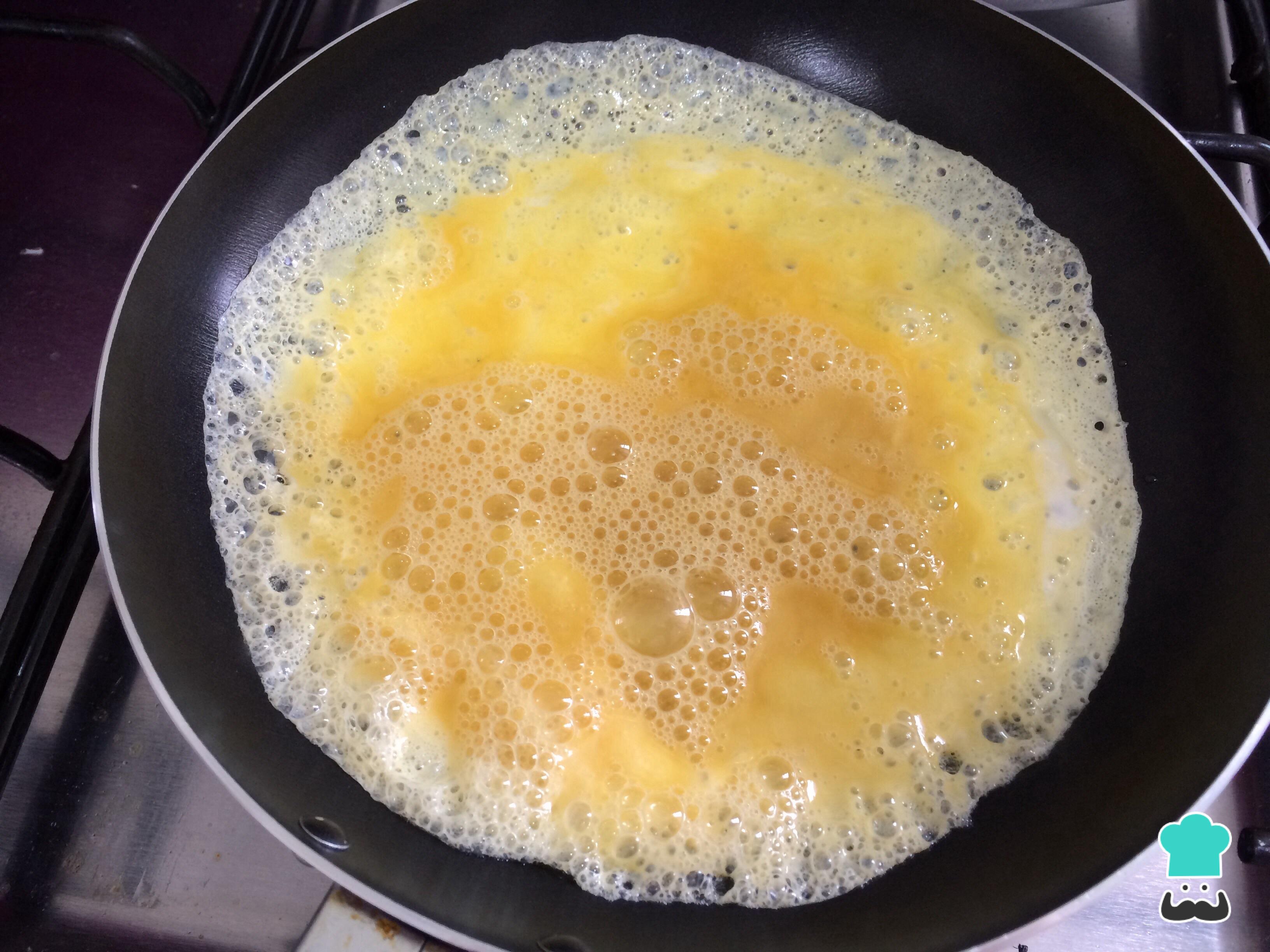 Aparte, en una sartén con aceite, hacer una tortilla delgada con los huevos batidos, cuando esté completamente cocinada cortar en tiras y mezcla con el arroz.
