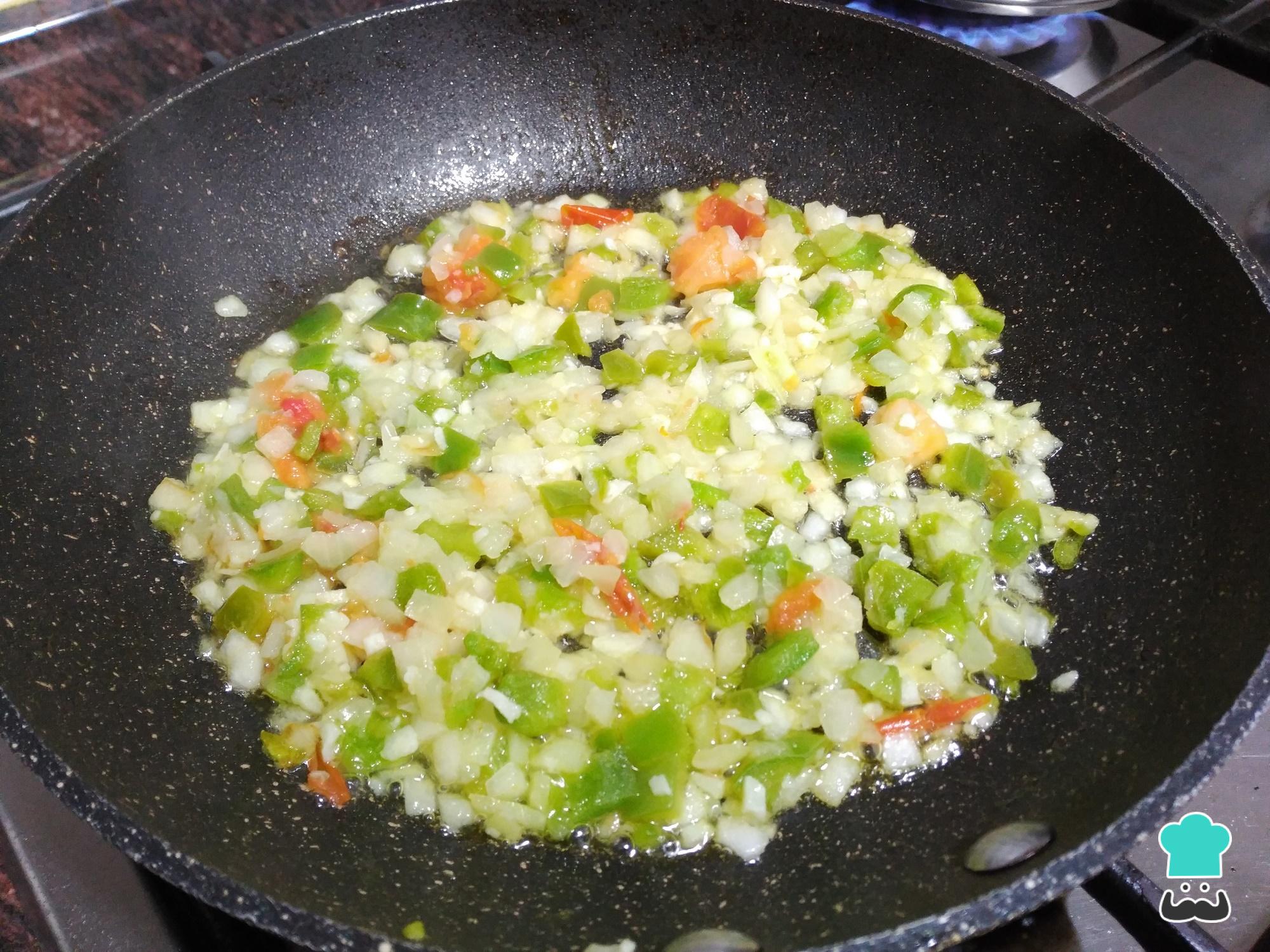 Mientras tanto, pela y pica la cebolla y el diente de ajo, y limpia y pica también el pimiento verde y el rojo, y empieza a pochar todas las verduras en una sartén con un chorrito de aceite. Pon muy poquito para que el arroz integral con champiñones de dieta tenga menos calorías.