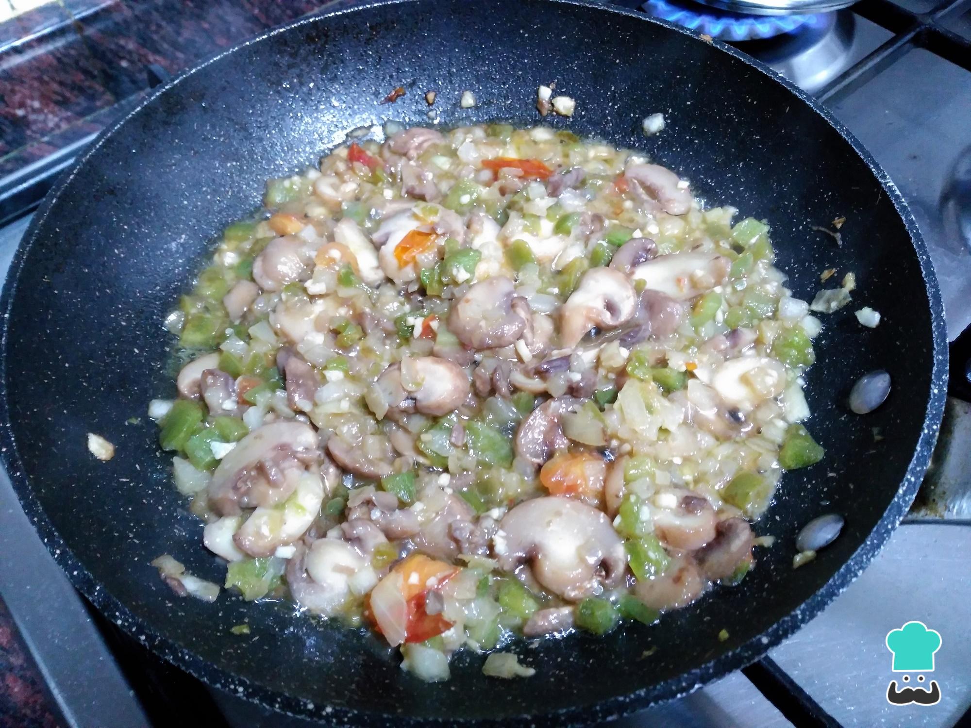 Cuando la cebolla esté transparente, añade los champiñones laminados y sigue sofriendo todos los ingredientes del arroz integral con verduras.