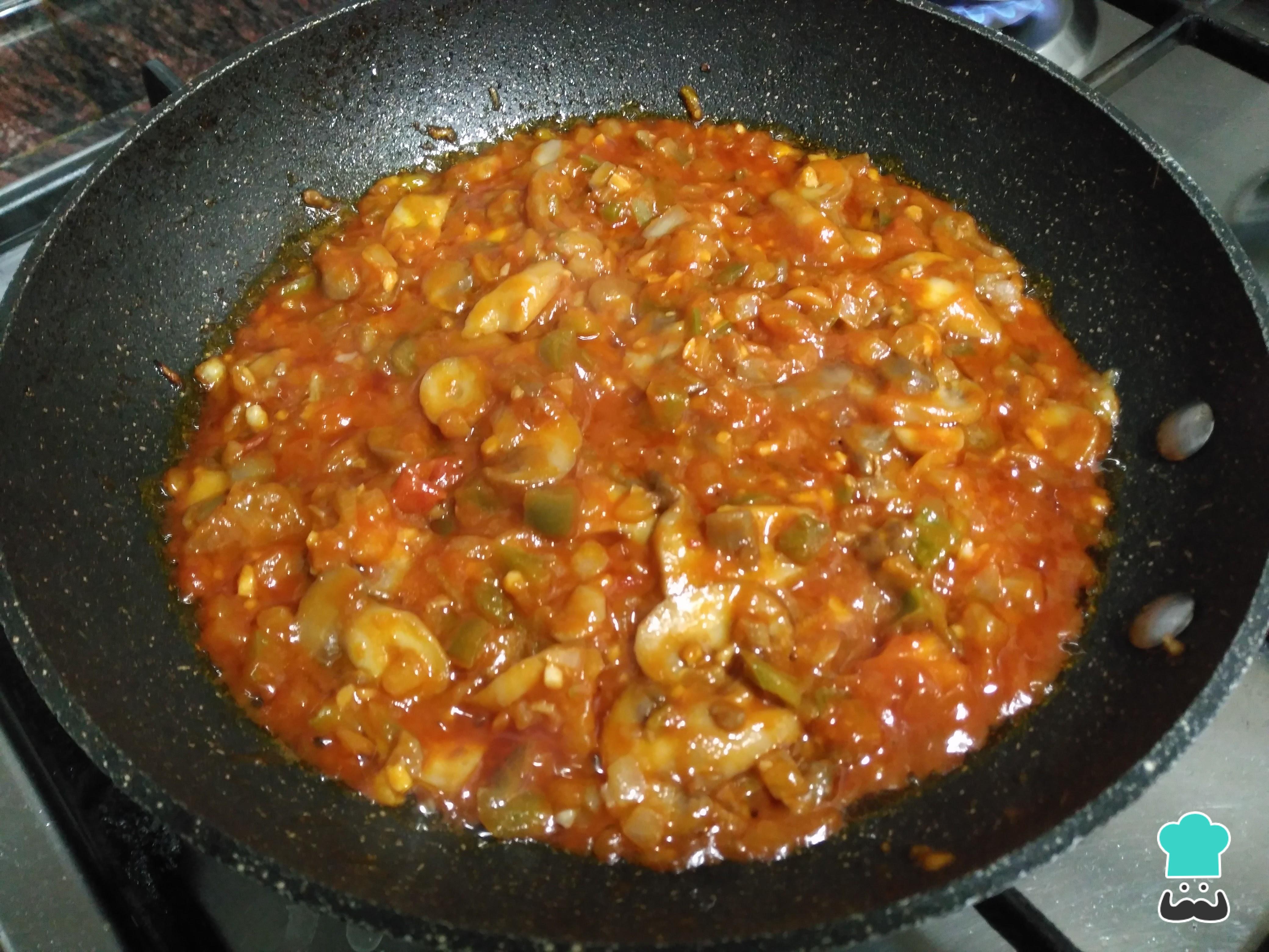 Una vez las verduras y los champiñones estén bien hechos, añade el tomate frito o natural a la sartén. Si escoges el tomate natural el arroz integral con setas tendrá muchas menos calorías pero tardarás más en hacerlo porque tendrás que esperar a que se fría bien.