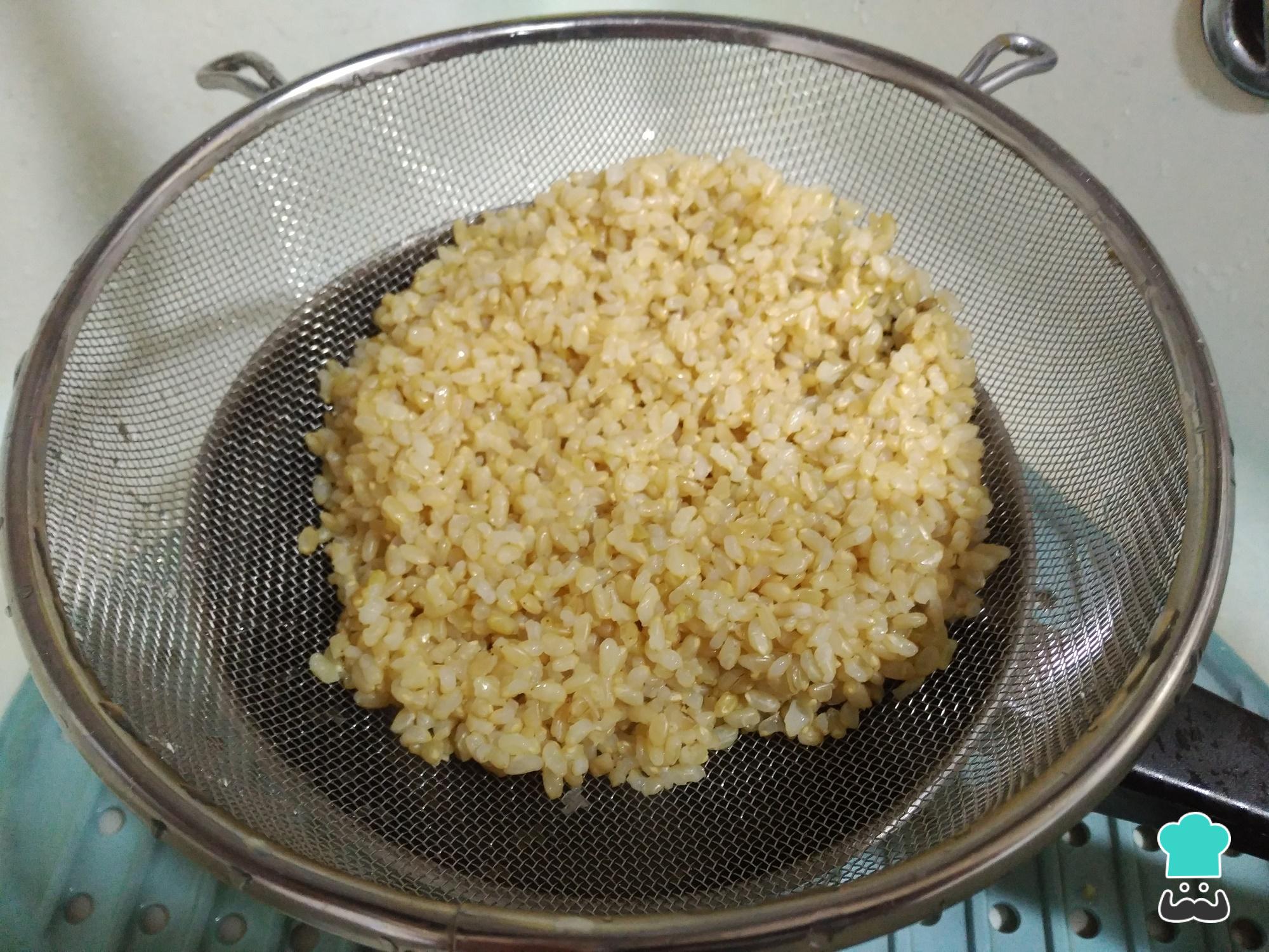Pasada la media hora, comprueba que esté cocido y escurre bien el arroz integral. Normalmente con 30 minutos de cocción da de sobras para que se cueza bien este tipo de arroz pero si lo quieres al dente, de´jalo unos 5 minutos menos hirviendo.