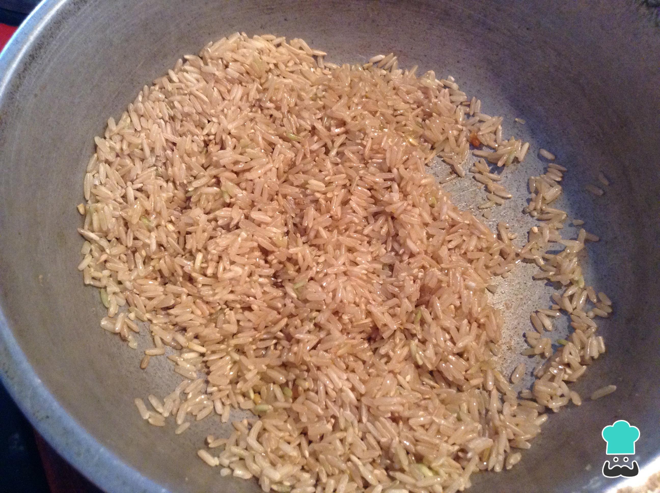 Agrega el arroz integral y sofríelo durante un par de minutos recordemos el arroz integral es el arroz que no se ha procesado y todavia contiene el pistilo lo cual hace que su cocción sea un poco más lenta que el normal.Por que utilizar este tipo de arroz? son carbohidratos complejos el cual contiene mucha fibra que se concentra en las capaz externas de este tipo de arroz teniendo en cuenta ademas que es rico en vitaminas y minerales ideal para personas que quieran incluir alimentos más saludables en su dieta alimenticia.