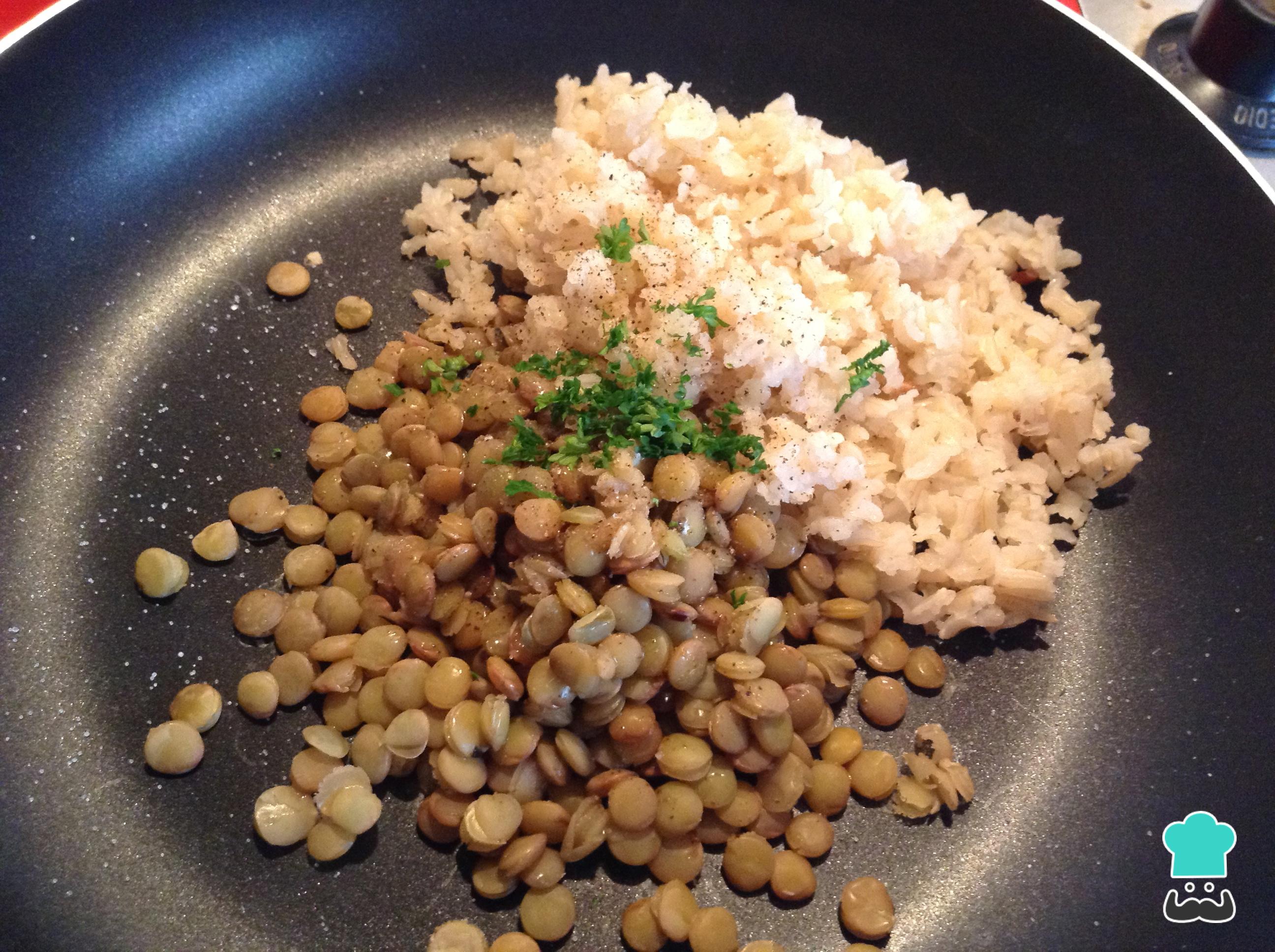 Llevar un sartén a fuego medio agregar el arroz integral y las lentejas sin el caldo, adicionar el perejil fresco finamente picado y si deseas un poco de sal y pimienta al gusto.Sofríe durante unos minutos y mezcla muy bien hasta que se integren los ingredientes.