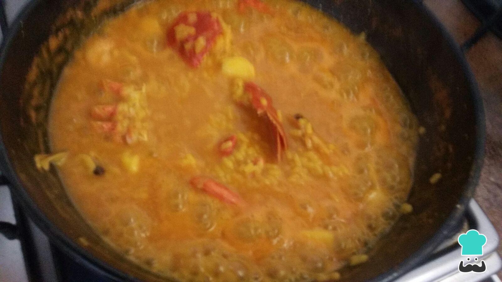 Luego, se añaden los cuatro dientes de ajo pelados y picados, y se deja rehogar unos segundos más. Después, se incorpora el arroz, rehogamos unos segundos y vertemos el caldo de pescado previamente preparado. También podemos utilizar agua, pero el caldo aportará un sabor más intenso. Se deja cocinar durante 14 minutos, aproximadamente, y se añade sal al gusto.