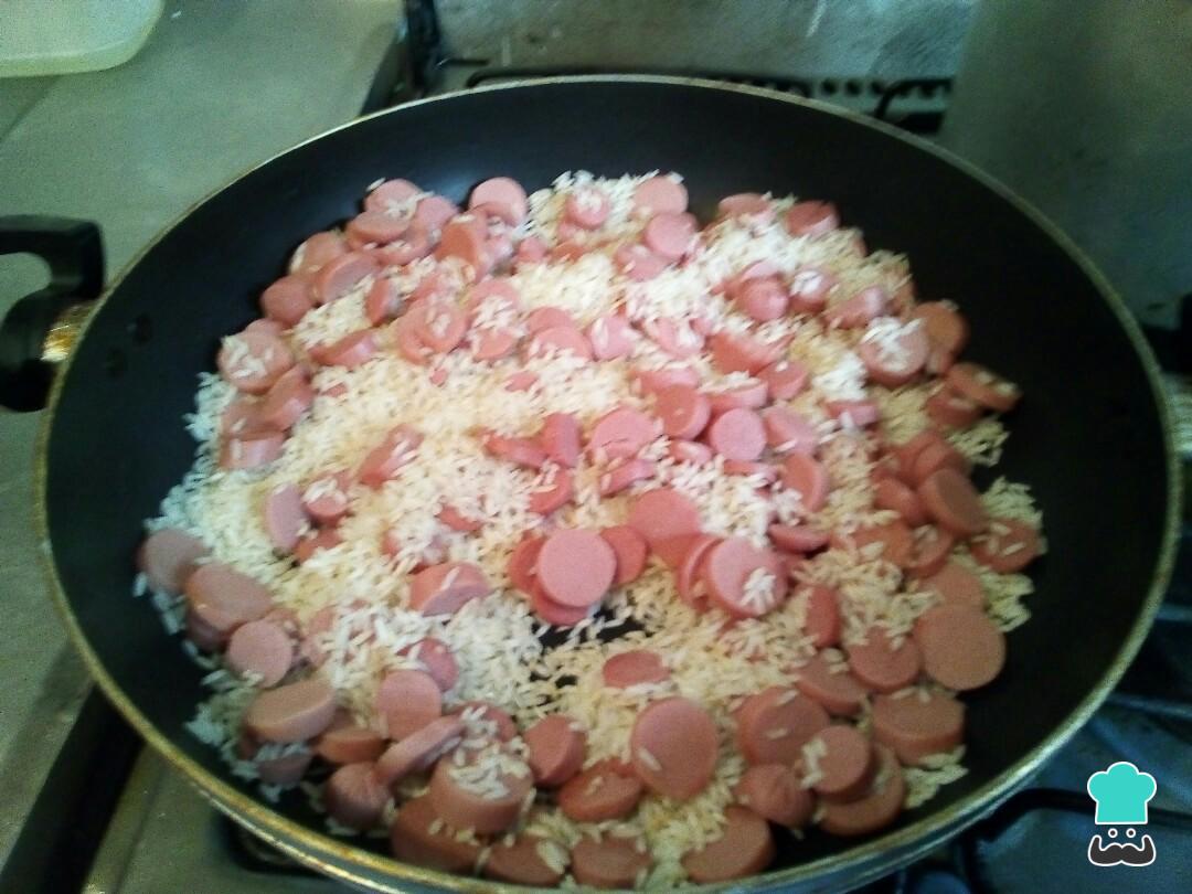 Ahora ubicamos una arrocera o una sartén lo suficientemente amplia y freímos el arroz, previamente escurrido, junto con las salchichas cortadas en rodajas. Esperamos hasta que el arroz empiece a dorarse un poco y cambien de color.