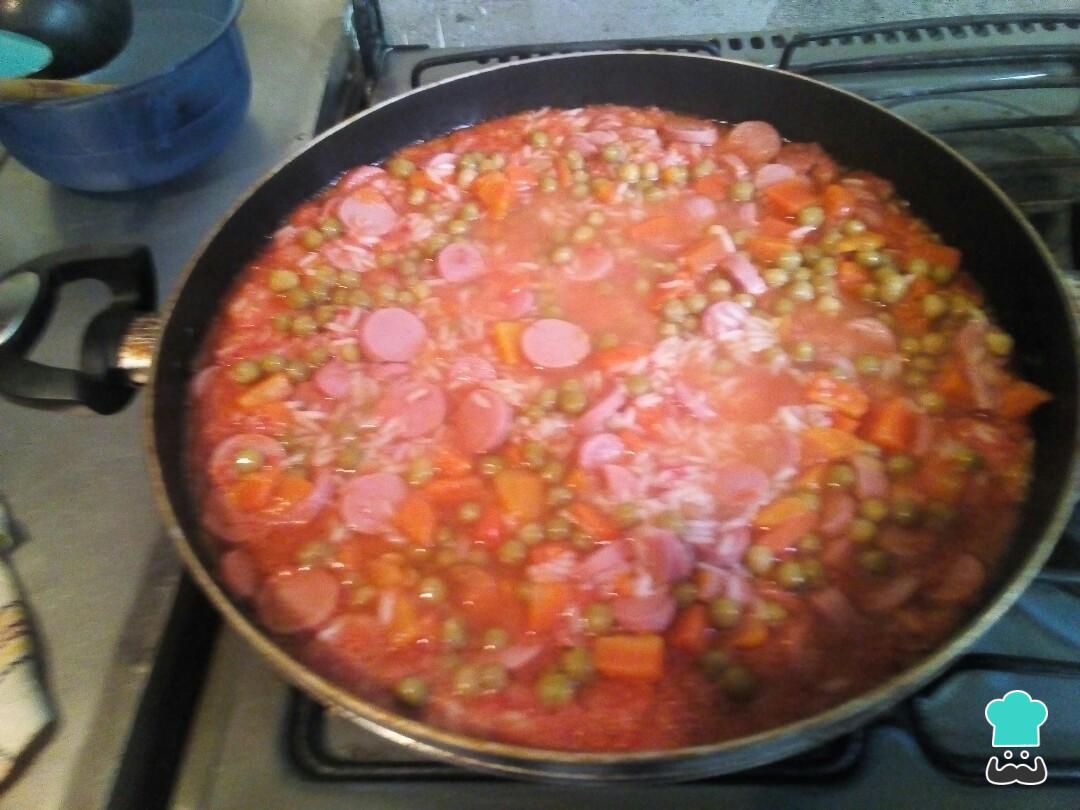 Esperamos unos minutos y añadimos agua o si puede ser, caldo de pollo hasta que lo cubra. Dejamos cocinar durante unos 5 minutos y entonces añadimos los chícharos y las zanahorias en rodajas. Mantenemos la cocción con la sartén tapada y a fuego medio hasta que se haya consumido todo el líquido.