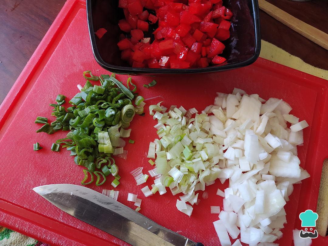 Para comenzar con esta receta de arroz navideño, corta la cebolla, el puerro, el pimentón y la zanahoria en cuadritos pequeños.