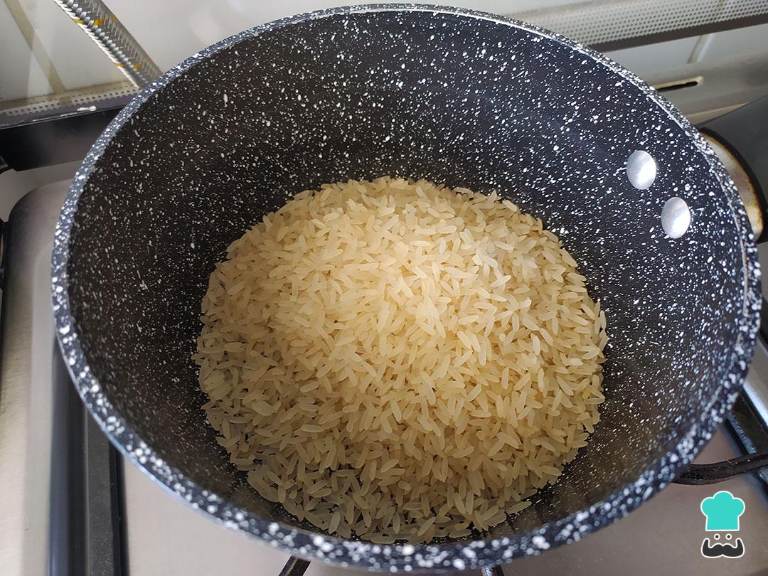En la olla agrega un cucharada de aceite y tuesta el arroz crudo después de lavarlo por 5 minutos. Resérvalo en un cuenco.