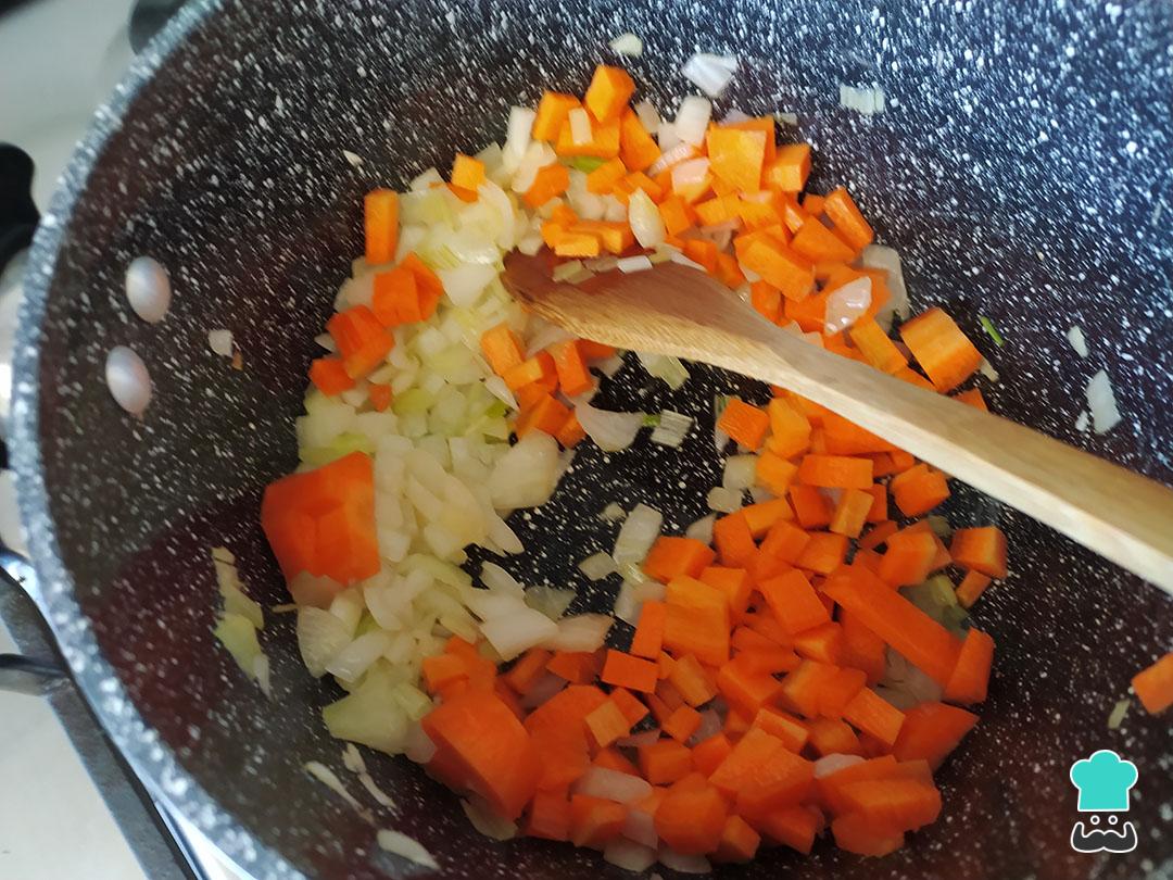 Agrega una cucharada de aceite en la olla y agrega la cebolla y la zanahoria, sofríe por 10 minutos revolviendo constantemente.