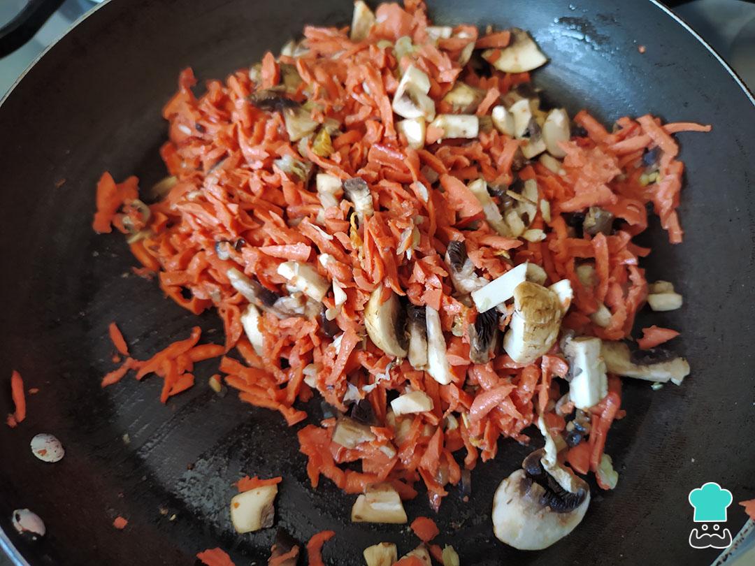 Si tienes champiñones enteros, filetéalos, y corta el jamón en trozos pequeños. En una sartén con una cucharada de aceite saltea los champiñones junto con el jamón y el ajo, revolviendo de vez en cuando. Sofríe por 10 minutos o hasta que los champiñones estén blandos. Si utilizaste chuleta puedes rallarla y recuerda salpimentarla en este paso.