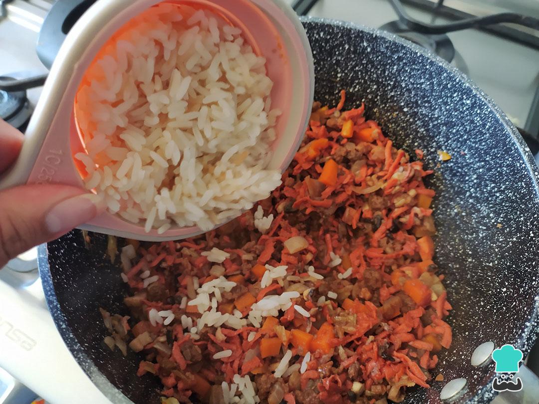 Agrega este sofrito y el arroz a la cebolla con zanahoria, llena con 1 taza de agua, agrega sal y pimienta a gusto y espera a que el arroz esté blando.