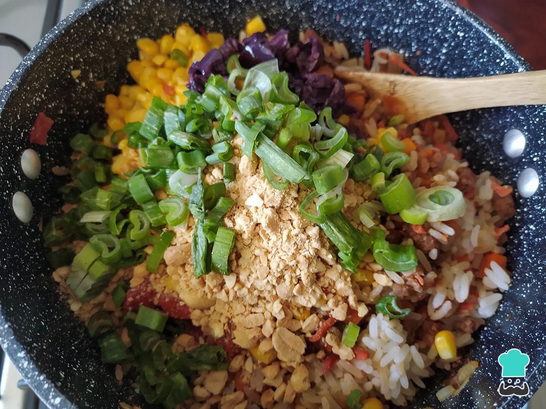 Antes de que se seque por completo agrega el maíz, el puerro cortado bien pequeño y, si utilizas, las pasas y el maní o cacahuete troceado.