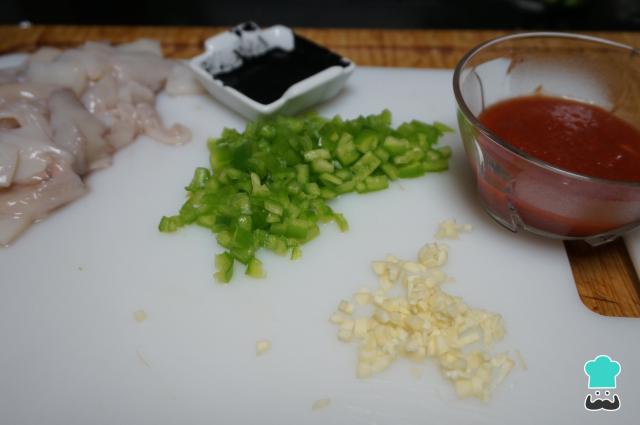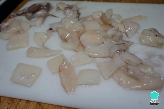 Limpia la sepia quitando la piel y toda la suciedad. Corta las patas para limpiar también por debajo. Una vez limpia, seca la sepia y córtala en trozos. Este paso en algunas pescaderías te lo pueden hacer.