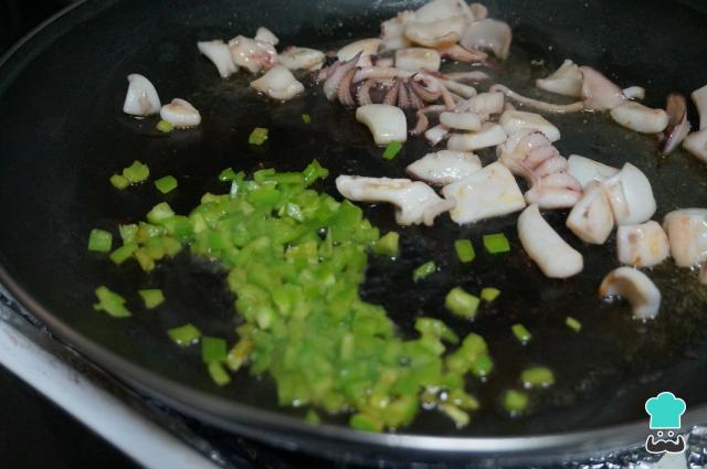 Añade un buen chorro de aceite en la cazuela que usarás para cocinar el arroz negro con sepia y caliéntala a fuego fuerte. Añade la sepia y saltéala unos minutos. Baja el fuego a medio, deja en un lado la sepia y agrega el pimiento verde.