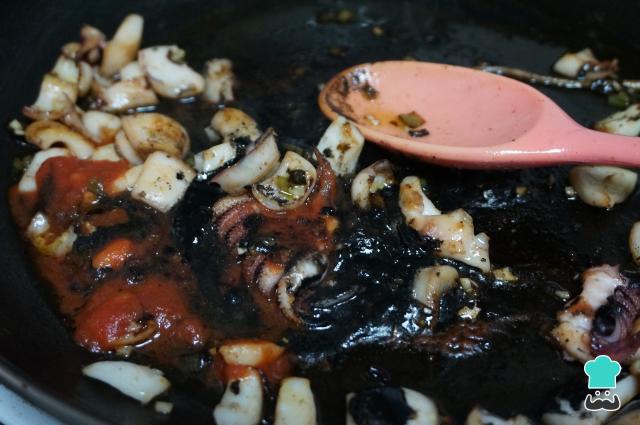 Agrega el tomate frito y la tinta, remueve y mezcla bien. Si hace falta añadir un par de cucharadas de agua para que se mezcle mejor, agrégalas.