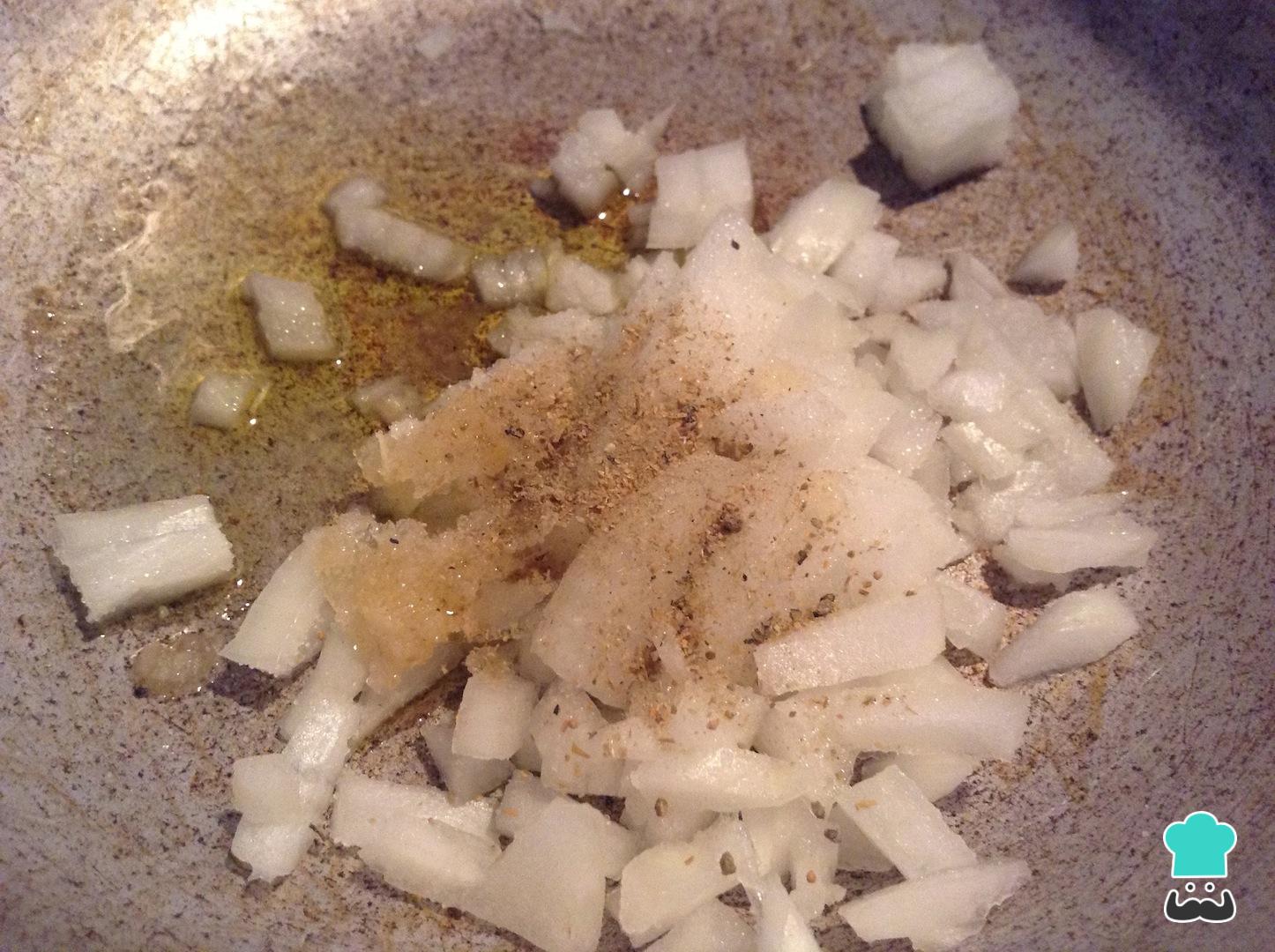 Lleva una sartén a fuego medio con el aceite de oliva, añade la cebolla blanca finamente picada, sal, pimienta negra y la pasta de ajo.