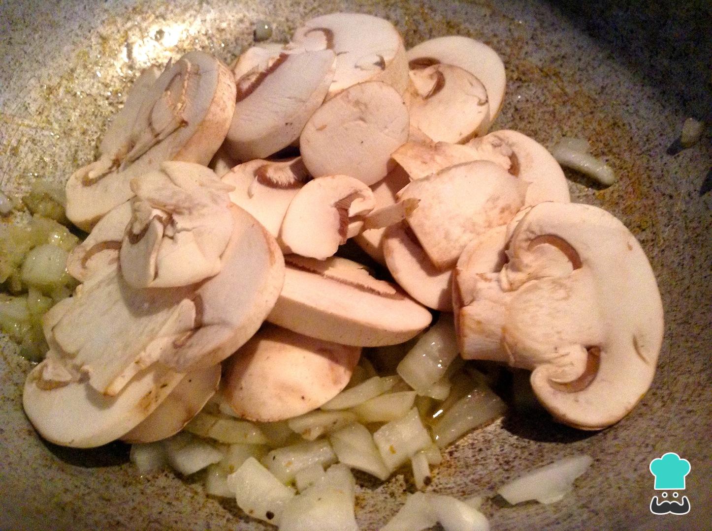 Una vez observes que nuestra cebolla toma un tono transparente, adiciona los champiñones tajados, o las setas que más te gusten, y deja sofreír durante algunos minutos.