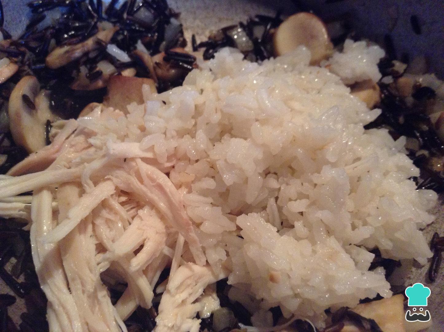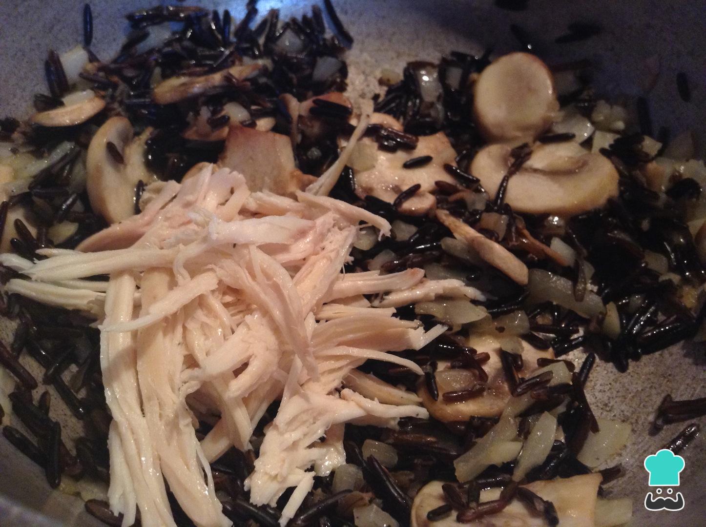 Adiciona el pollo desmechado, mezcla bien hasta que se integren todos los ingredientes del arroz salvaje con carne y setas.