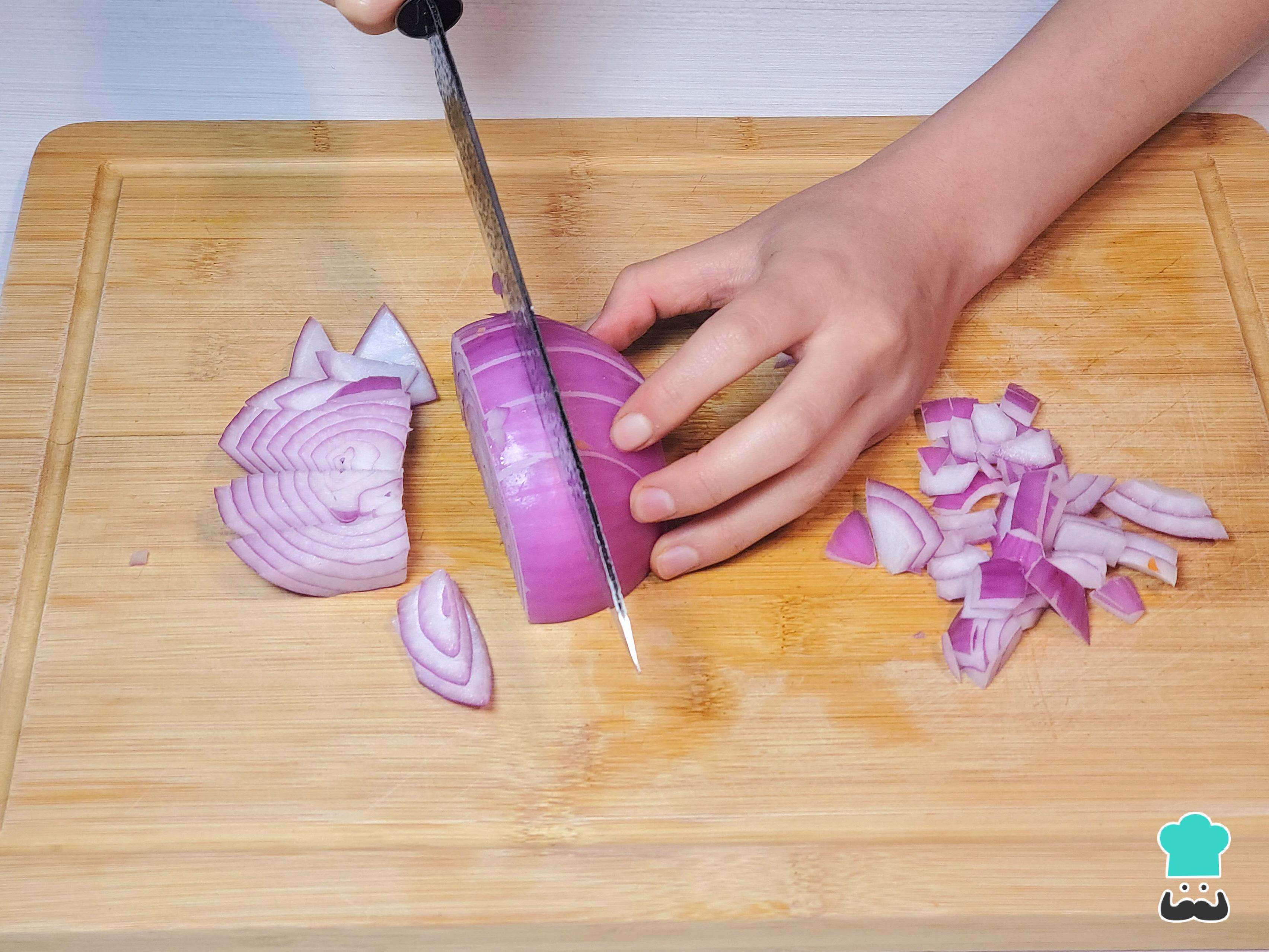 Para el asado de res, comienza cortando todos los vegetales de forma rústica, ya que posteriormente los trituraremos para hacer una salsa. Los vegetales son cebolla, zanahorias, poro y tomates.