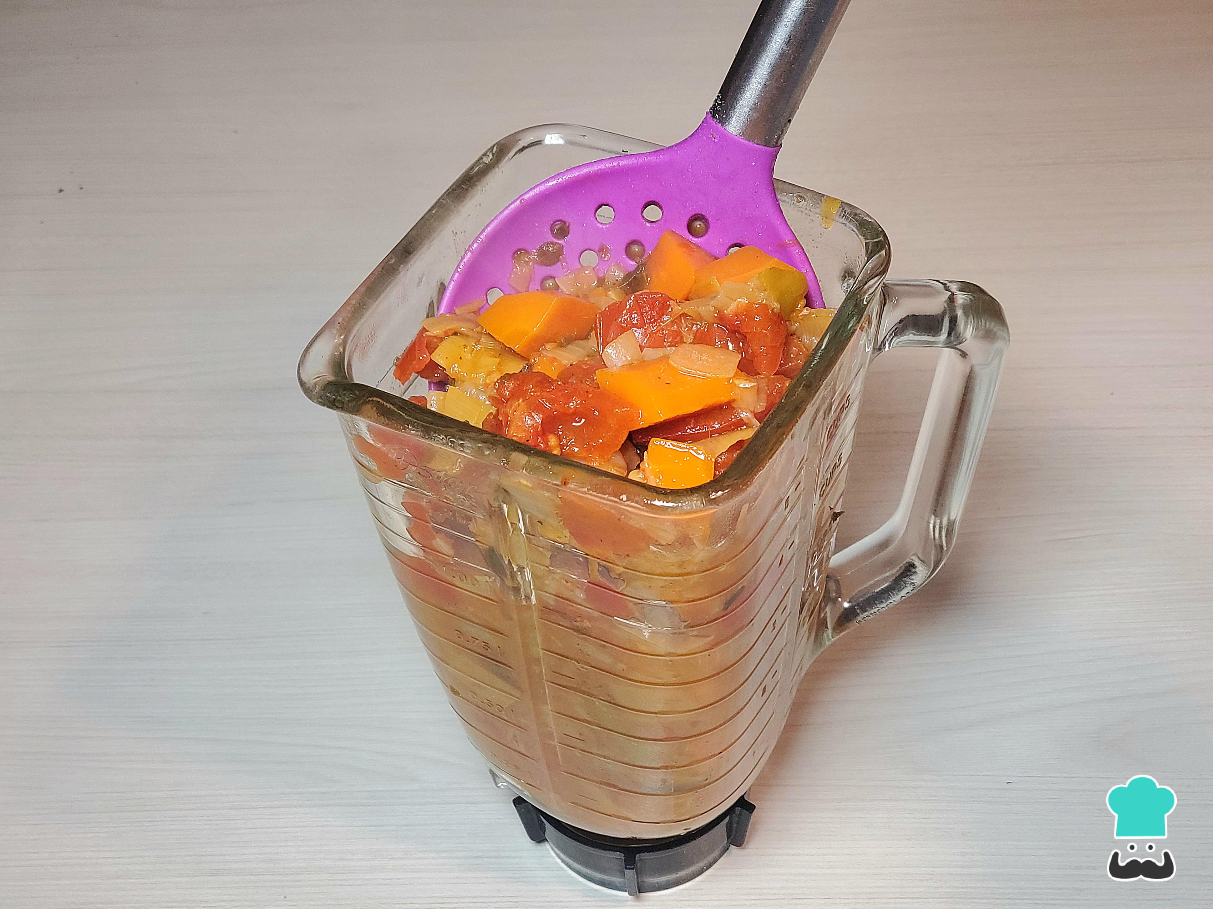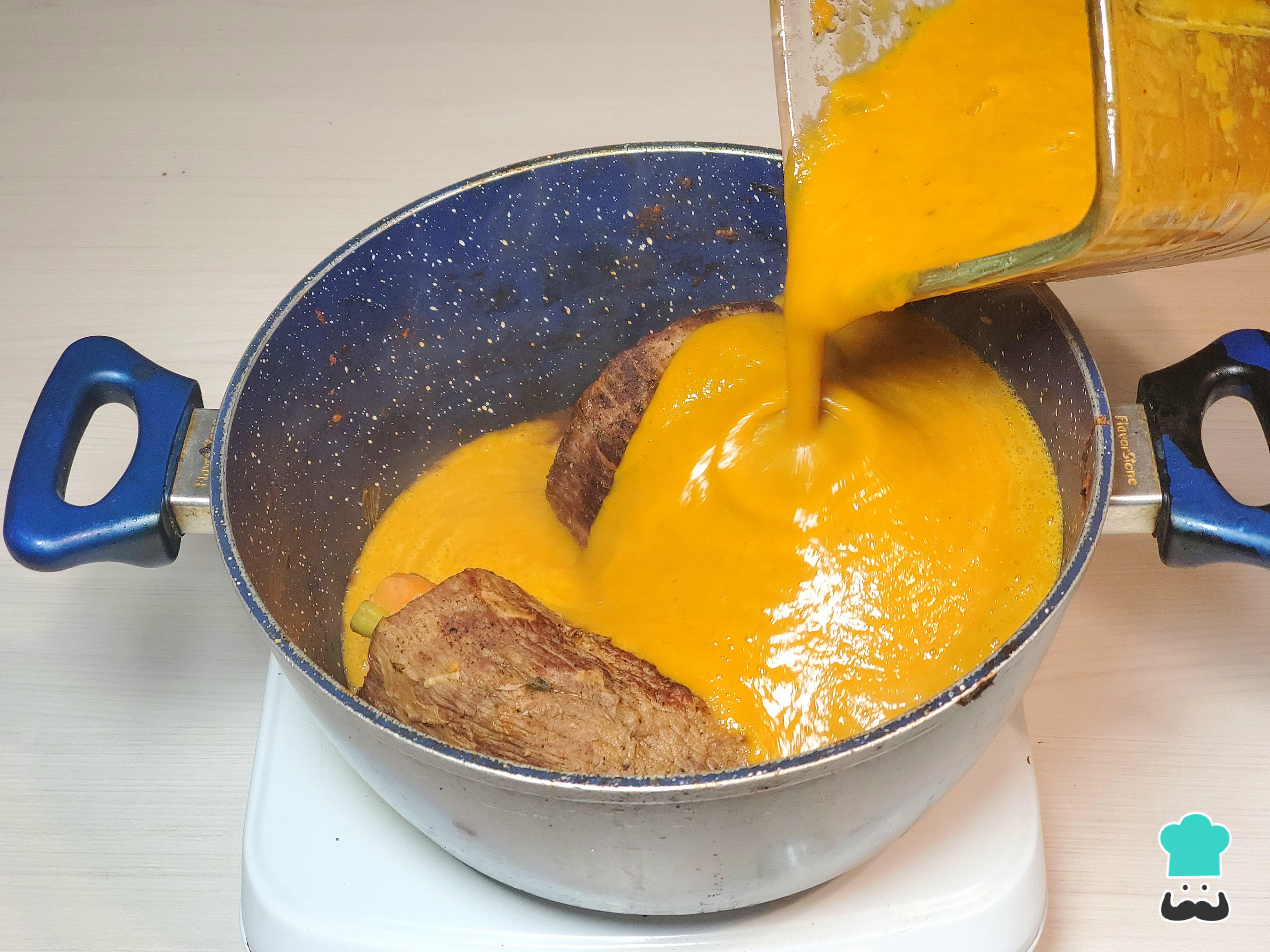 Cuando la carne esté bien cocida, retírala y córtala en rodajas. Mientras tanto, coloca todos los vegetales con el caldo de carne en la licuadora y tritúralos hasta obtener una salsa suave.